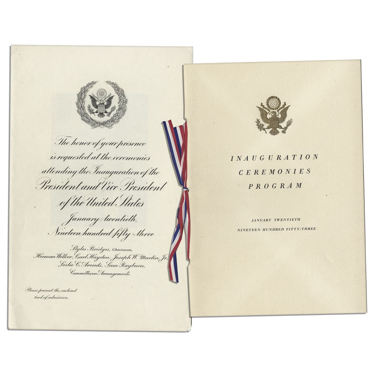 Invitation and program from the Presidential inauguration of Dwight D. Eisenhower and Vice President Richard Nixon, held 20 January 1953. Printed card-style invitation opens to loose portraits of the President and VP. Program has a gilt presidential seal on the front and runs 4pp. Bound with a red, white and blue ribbon. Invitation measures 6.5'' x 10''. Program measures 6.25'' x 9''. Near fine.