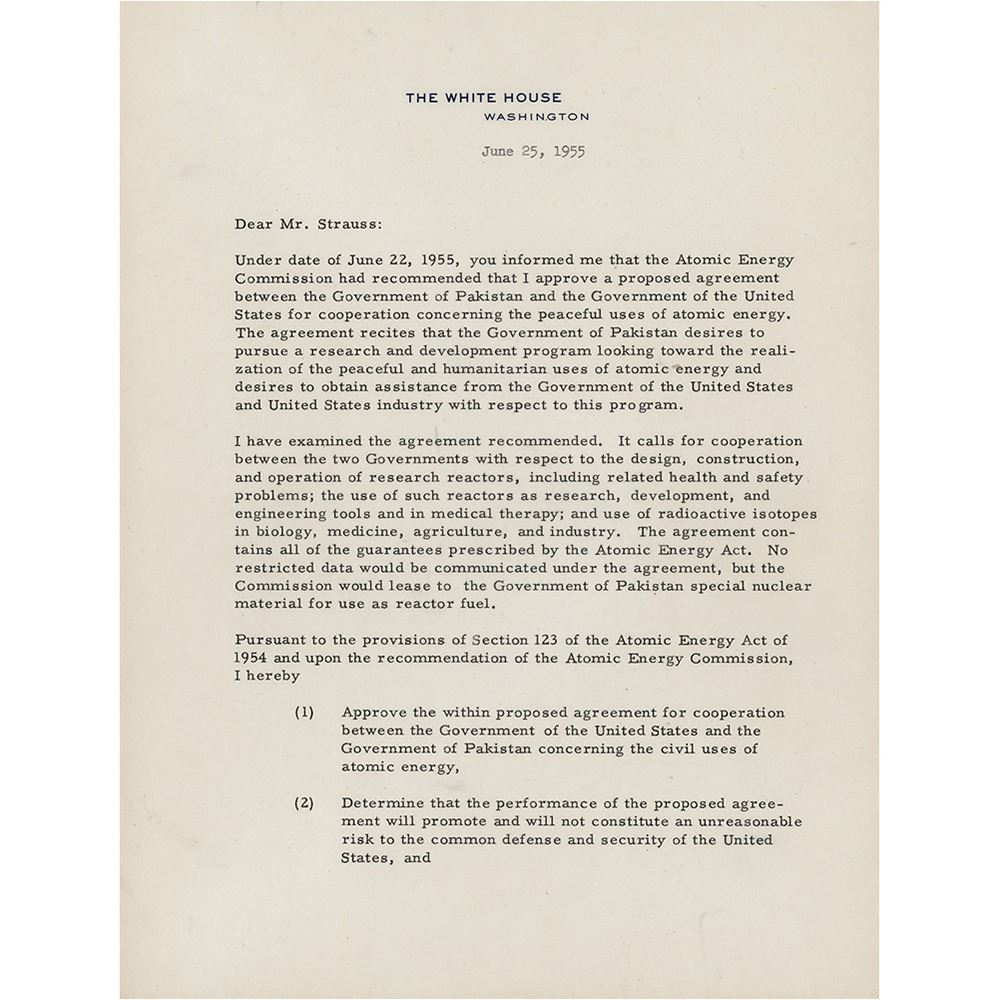With the Atoms for Peace program, Dwight D. Eisenhower established a new world order of American dominance in atomic energy and nuclear technology and enhanced American world leadership during the Cold War. Subsequently, he also launched Pakistan on the path toward securing ‘the bomb’ for itself. In this important letter, Eisenhower authorizes the cooperation agreement between the United States and Pakistan to share American nuclear know-how and materials. It provides for cooperation in developing and constructing nuclear reactors for research in medicine, biology, agriculture, and industry, including the leasing of American nuclear material for use as reactor fuel. Because of recent discoveries in the West, the United States largely controlled the world uranium market.