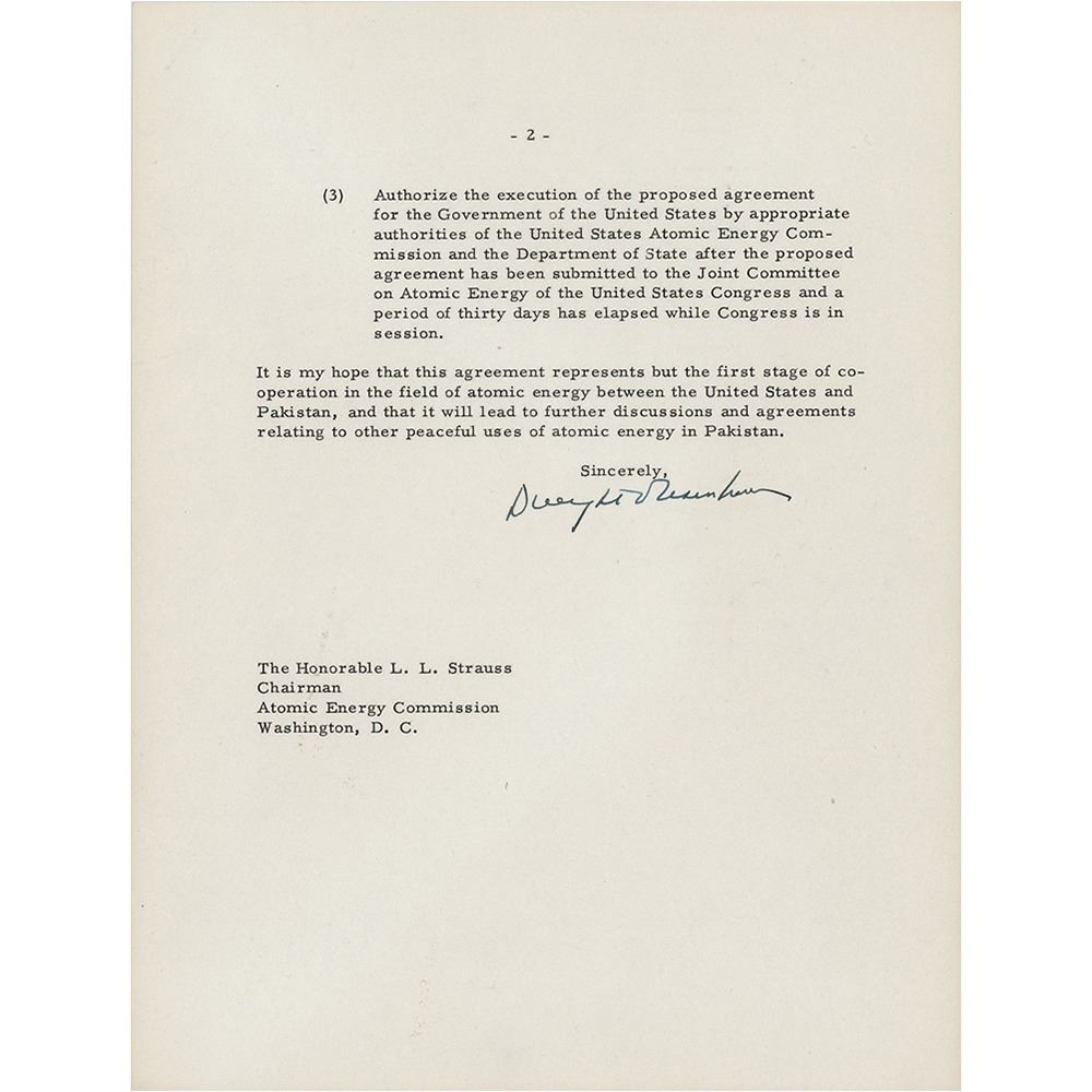 It is my hope that this agreement represents but the first stage of cooperation in the field of atomic energy between the United States and Pakistan, and that it will lead to further discussions and agreements relating to other peaceful uses of atomic energy in Pakistan." In very fine condition. A spectacular presidential letter on significant scientific and military matters that helped to define the postwar world order.