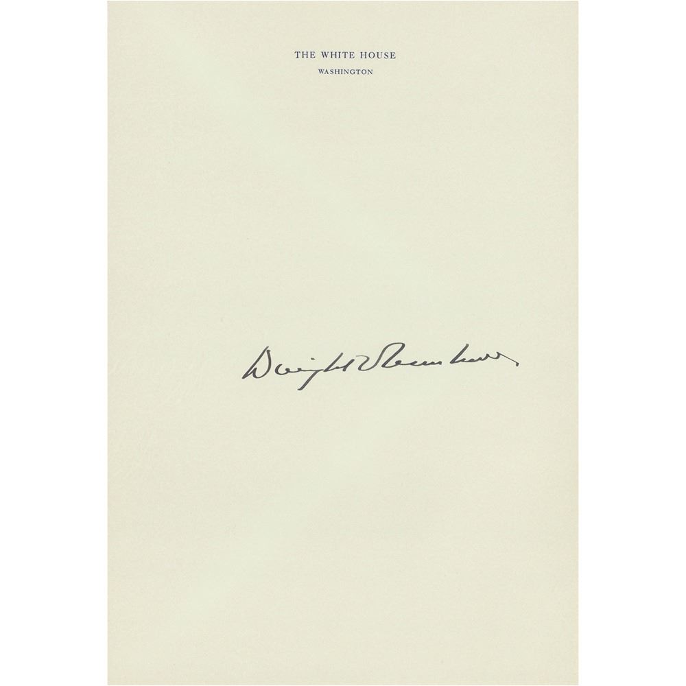 Fountain pen signature as president, "Dwight D. Eisenhower,” on an off-white 7 x 10.25 sheet of blank official White House letterhead. In fine condition.