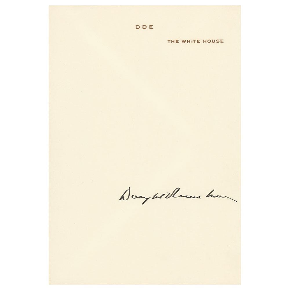 Fountain pen signature as president, "Dwight D. Eisenhower,†on an off-white 7 x 10.25 sheet of blank personal White House letterhead. In fine condition.