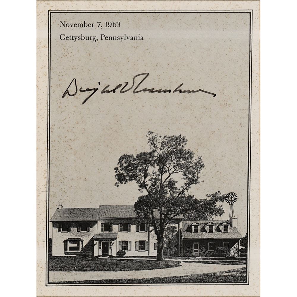 Fountain pen signature, "Dwight D. Eisenhower," on an unused 4.25 x 5.75 bookplate with imagery of Eisenhower's home and farm in Gettysburg, Pennsylvania. In fine condition. Accompanied by a first edition of Mandate for Change, hardcover with dust jacket, published by Doubleday & Company in 1963; the dust jacket bears scuffs, tears, and stains.
