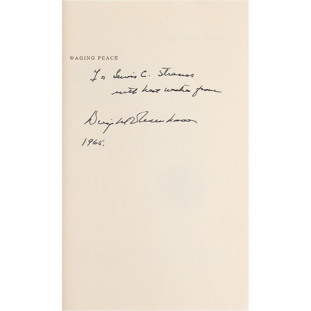 Signed book: Waging Peace: The White House Years, A Personal Account 1956-1961. First edition. NY: Doubleday & Company, 1965. Hardcover with dust jacket, 6.5 x 9.5, 741 pages. Signed and inscribed on the half-title page in black ink, "For Lewis C. Strauss, with best wishes from, Dwight D. Eisenhower." In very good to fine condition, with speckled staining to the dust jacket, heaviest along the spine.