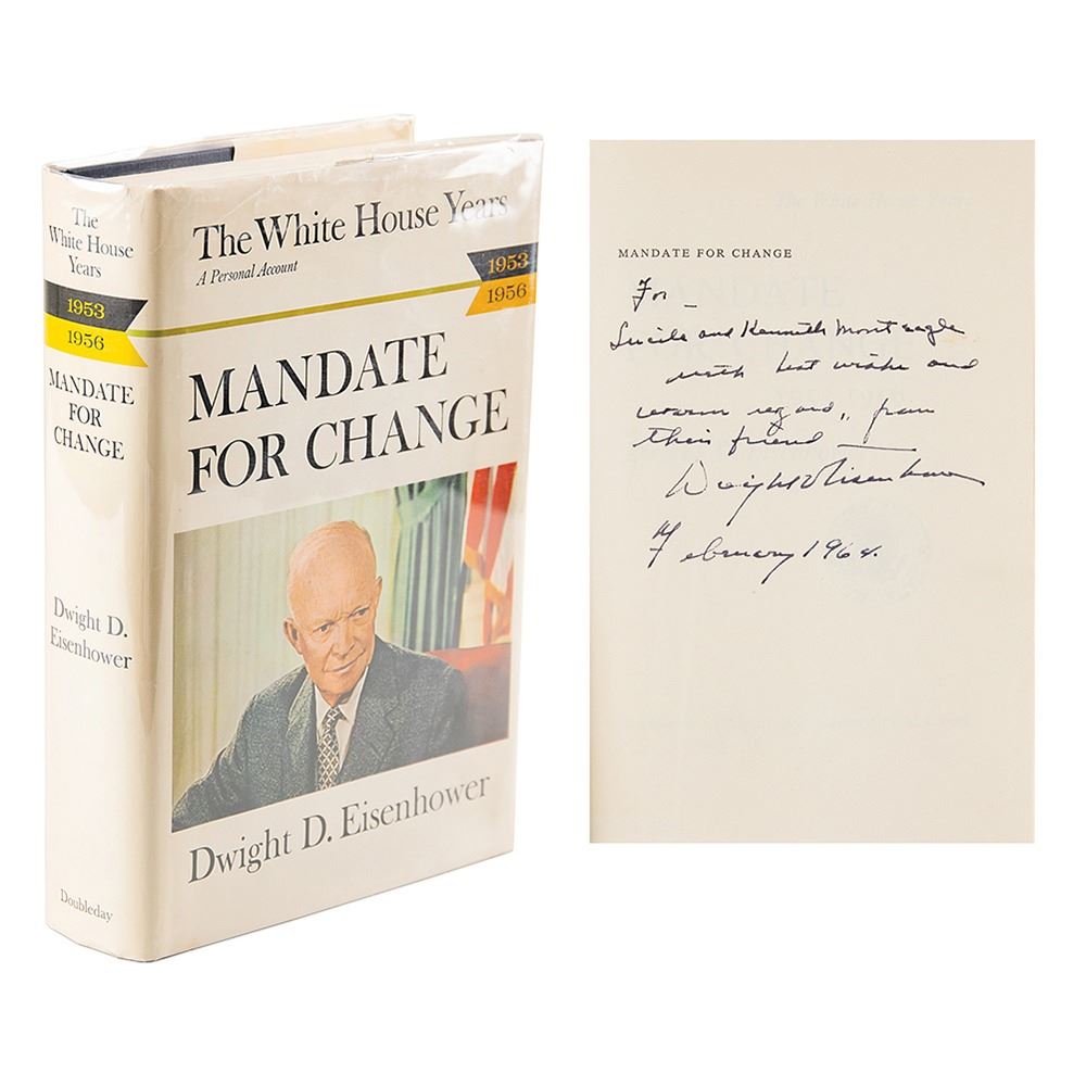 Signed book: Mandate for Change. First edition. NY: Doubleday, 1963. Hardcover with dust jacket, 6.25 x 9.5, 650 pages. Signed and inscribed on the half-title page in black ink, "For—Lucile and Kenneth Monteagle, with best wishes and warm regards from their friend—Dwight D. Eisenhower, February 1964." In fine condition.