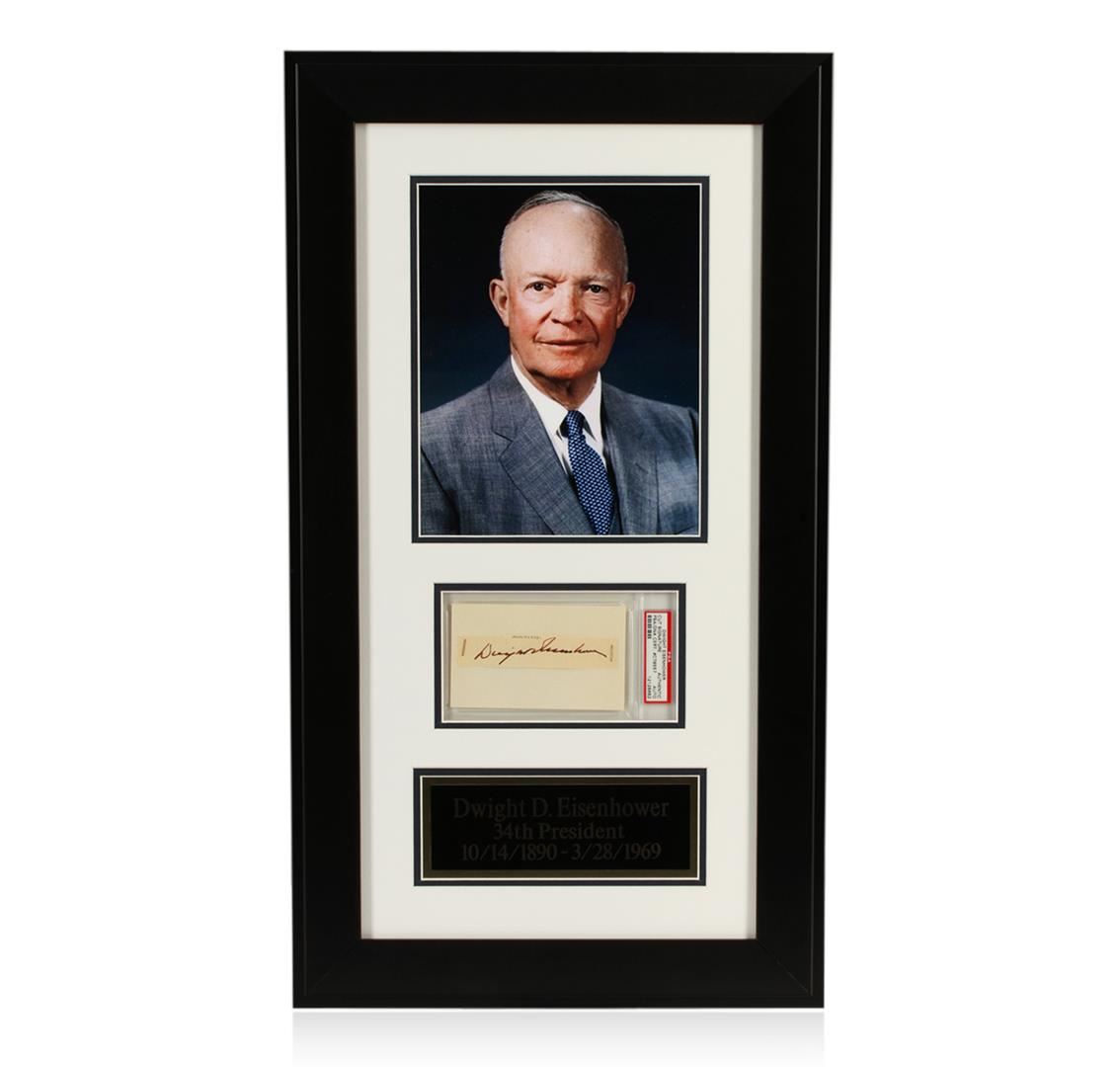 A one of a kind display featuring the autograph of President Dwight D. Eisenhower showcased in a beautiful custom matted display that features a photo of President Eisenhower. The signature is authenticated and encapsulated by PSA. Dwight David "Ike" Eisenhower (born David Dwight Eisenhower, October 14, 1890 - March 28, 1969) was the 34th President of the United States from 1953 until 1961. This piece comes framed and ready to hang! 15.5" x 27". PSA Certified.