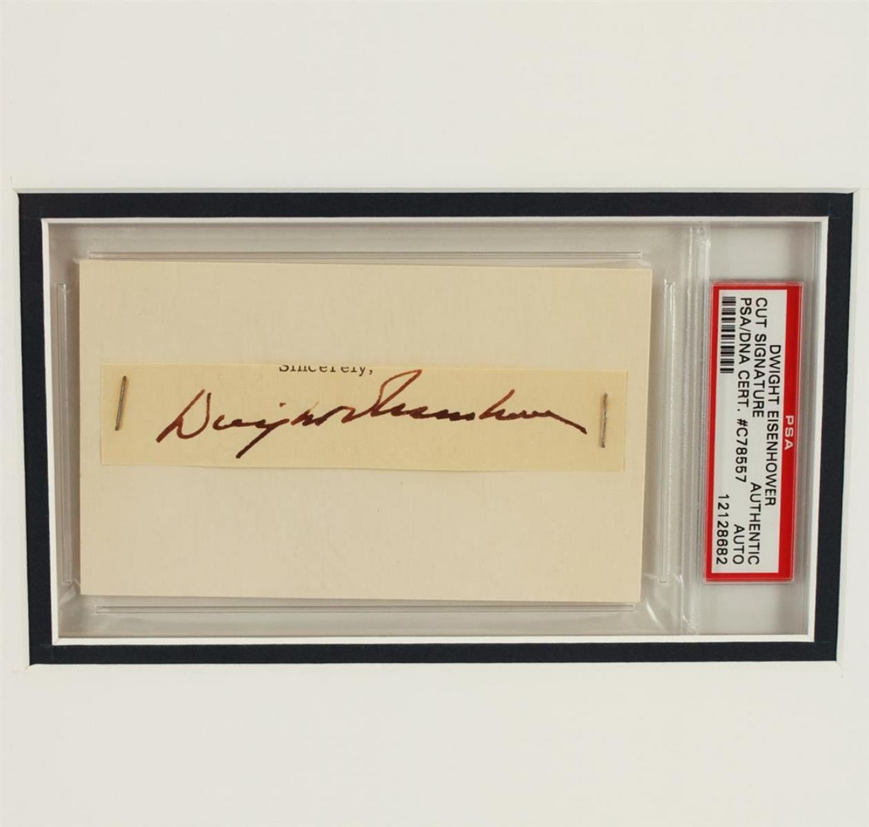 A one of a kind display featuring the autograph of President Dwight D. Eisenhower showcased in a beautiful custom matted display that features a photo of President Eisenhower. The signature is authenticated and encapsulated by PSA. Dwight David "Ike" Eisenhower (born David Dwight Eisenhower, October 14, 1890 - March 28, 1969) was the 34th President of the United States from 1953 until 1961. This piece comes framed and ready to hang! 15.5" x 27". PSA Certified.