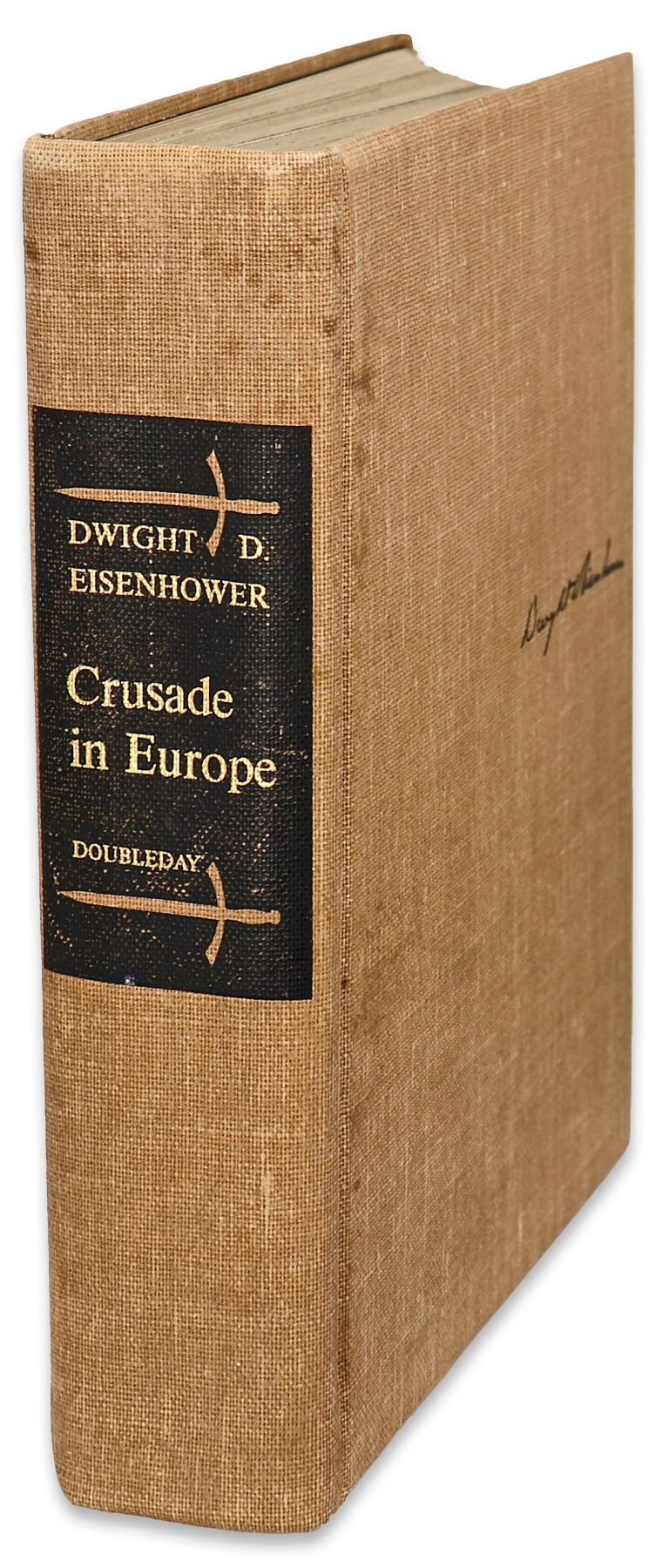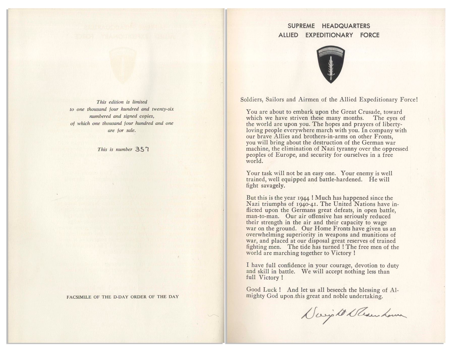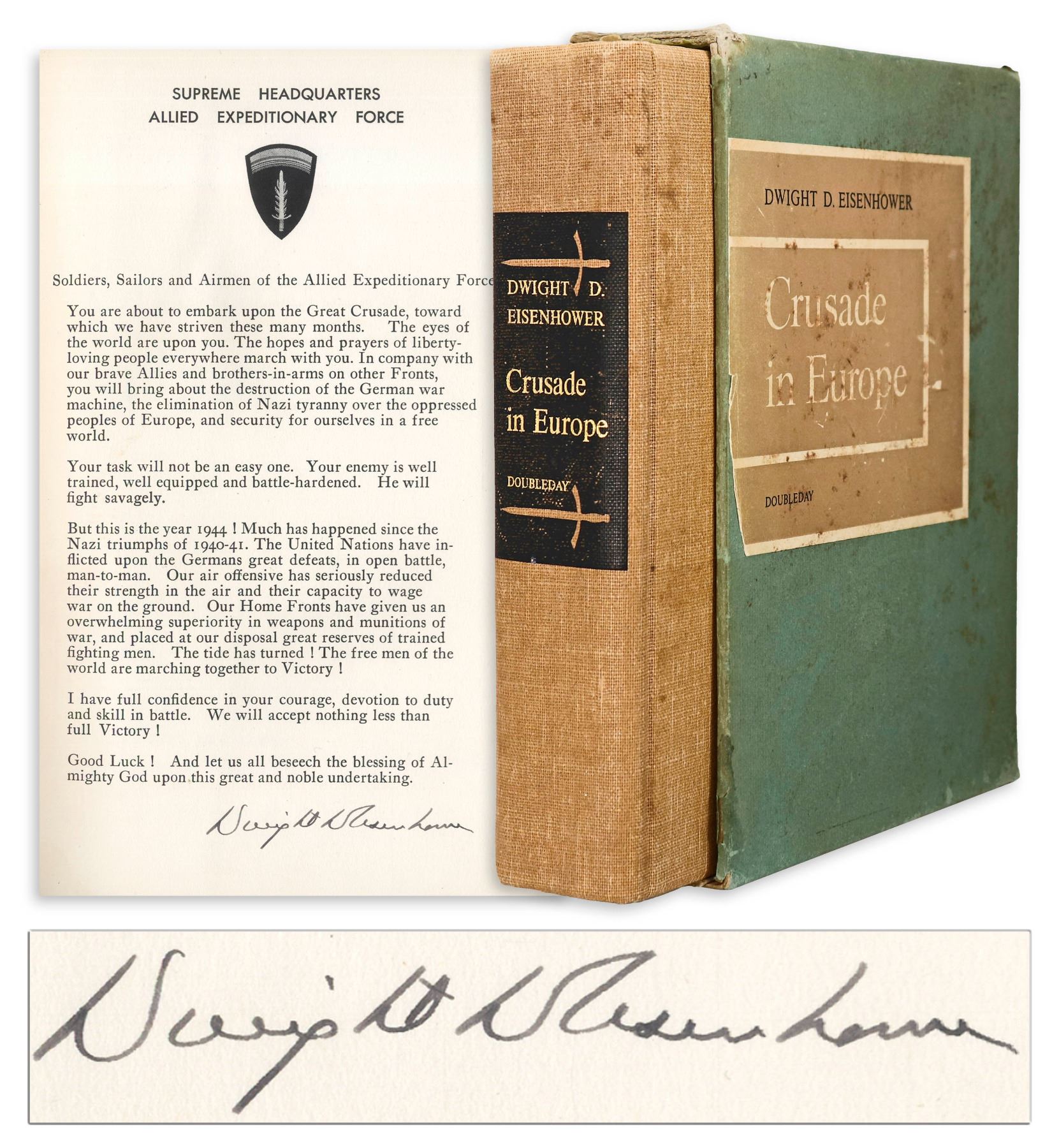 Dwight Eisenhower signed D-Day speech, contained within the first edition of ''Crusade in Europe'', Eisenhower's account of the Allied victory in Europe. Garden City, NY: Doubleday, 1948, book is number 357 of the signed limited edition of 1426. Eisenhower signs ''Dwight D Eisenhower'' to the bottom of the speech, which reads in part, ''Soldiers, Sailors and Airmen of the Allied Expeditionary Force!...Your task will not be an easy one. Your enemy is well trained, well equipped and battle-hardened. He will fight savagely. But this is the year 1944! Much has happened since the Nazi triumphs of 1940-41...'' Bound in light brown cloth boards with maps to endpapers, and top edge gilt. Photographs and illustrations throughout. Measures 6.75'' x 9.75'', in rare original sage green slipcase that measures 7'' x 10.25''. Moderate wear to slipcase, in good condition. Some discoloration to boards, and light discoloration to first few pages of book, overall in very good condition, with a near fine signature page. With JSA COA.
