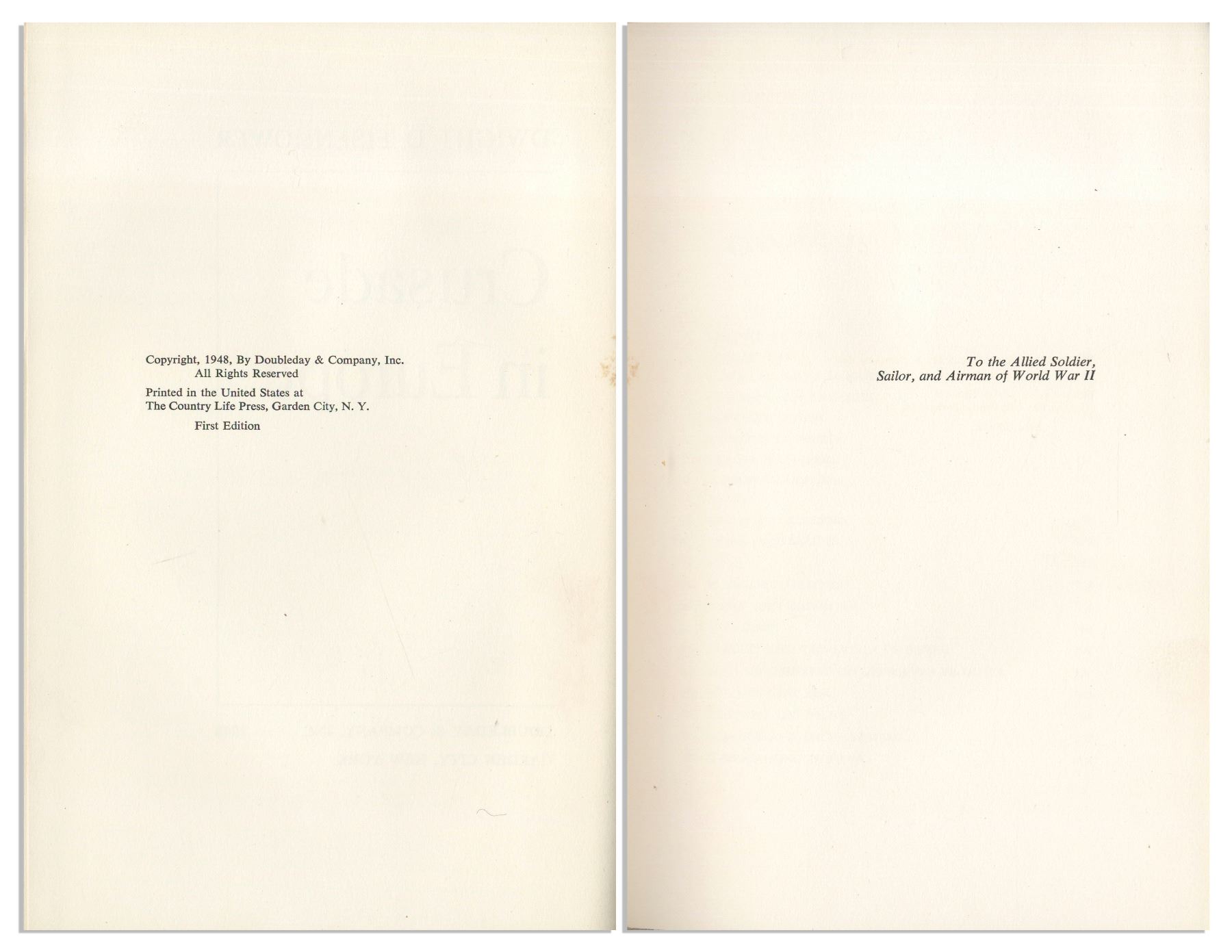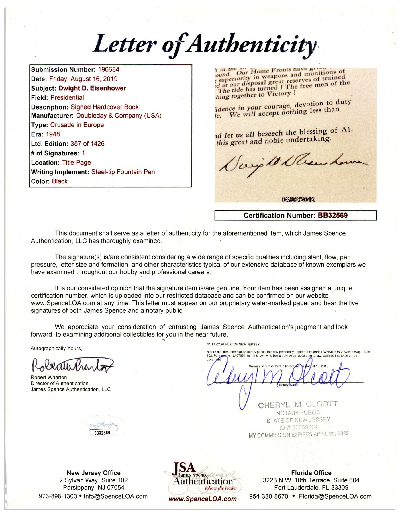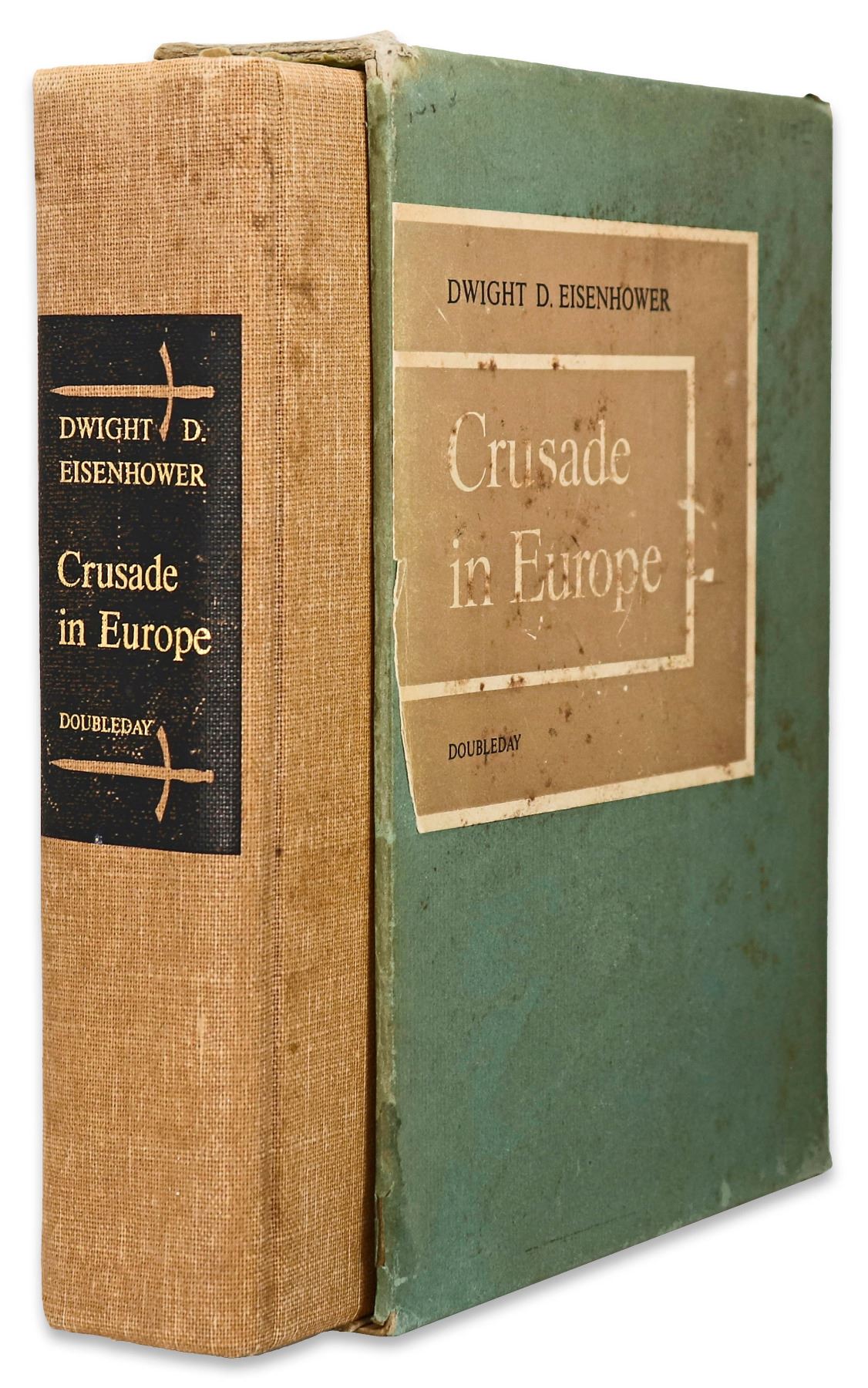 Dwight Eisenhower signed D-Day speech, contained within the first edition of ''Crusade in Europe'', Eisenhower's account of the Allied victory in Europe. Garden City, NY: Doubleday, 1948, book is number 357 of the signed limited edition of 1426. Eisenhower signs ''Dwight D Eisenhower'' to the bottom of the speech, which reads in part, ''Soldiers, Sailors and Airmen of the Allied Expeditionary Force!...Your task will not be an easy one. Your enemy is well trained, well equipped and battle-hardened. He will fight savagely. But this is the year 1944! Much has happened since the Nazi triumphs of 1940-41...'' Bound in light brown cloth boards with maps to endpapers, and top edge gilt. Photographs and illustrations throughout. Measures 6.75'' x 9.75'', in rare original sage green slipcase that measures 7'' x 10.25''. Moderate wear to slipcase, in good condition. Some discoloration to boards, and light discoloration to first few pages of book, overall in very good condition, with a near fine signature page. With JSA COA.