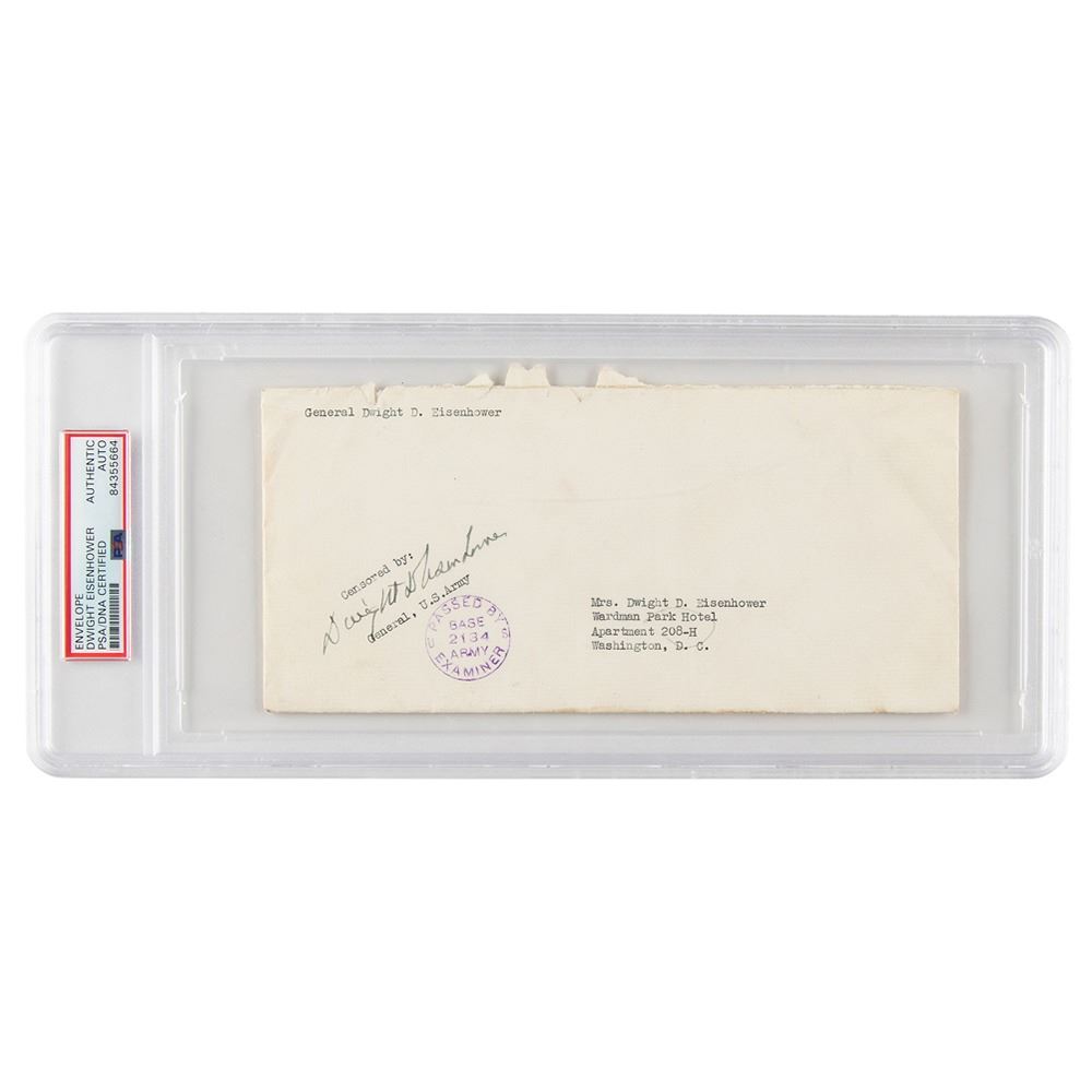 Word War II–era mailing envelope with "Allied Force Headquarters, Office of the Commander-in-Chief" on the flap, addressed in type to Mrs. Dwight D. Eisenhower at Wardman Park Hotel in Washington, DC, 8.25 x 3.75, signed with his censorship signature on the left side, "Dwight D. Eisenhower." In fine condition. Encapsulated in a PSA/DNA authentication holder.