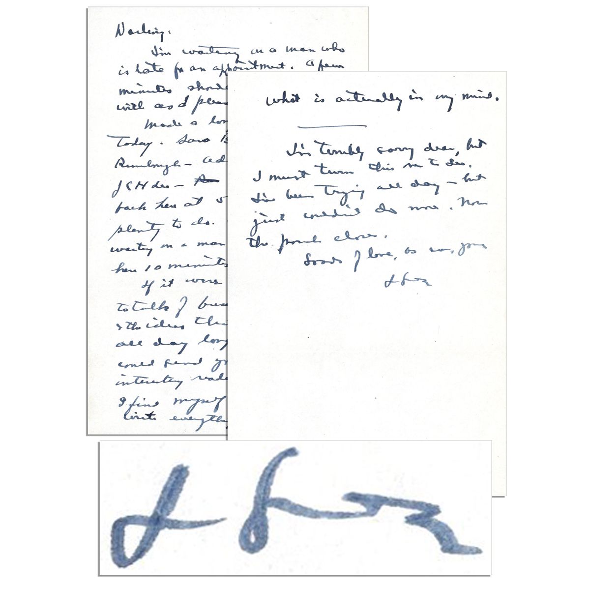 Dwight D. Eisenhower autograph letter signed as Lt. General to his wife Mamie in Washington, DC, circa 1942. His charming and personal letter to her reads in part: ''Darling, I'm waiting on a man who is late for an appointment. A few minutes should be mine to do with as I please. Made a long inspection trip today. Saw Bob Littlejohn - Rumlough - Adam Richmond - JCH Lee - & others. Got back here at 5:45 to find plenty to do. Now - 6:15 I'm waiting on a man who was due here 10 minutes ago. If it were wise (& permissible) to talk of business - work - & the ideas that fill my head all day long, I suspect I could send you much interesting reading. As it is I find myself trying to write everything except what is actually in my mind...'' Runs 2pp. and measures 6'' x 9''. Creasing, else near fine. Lot includes original mailing envelope.