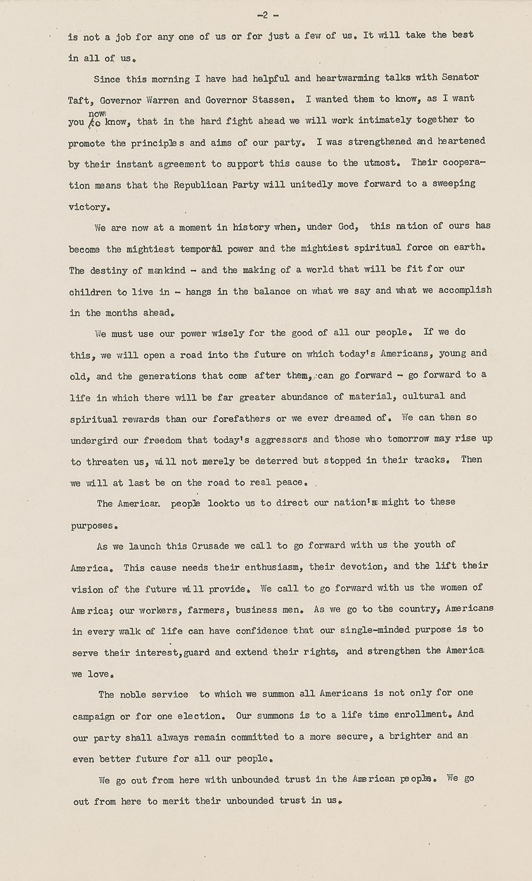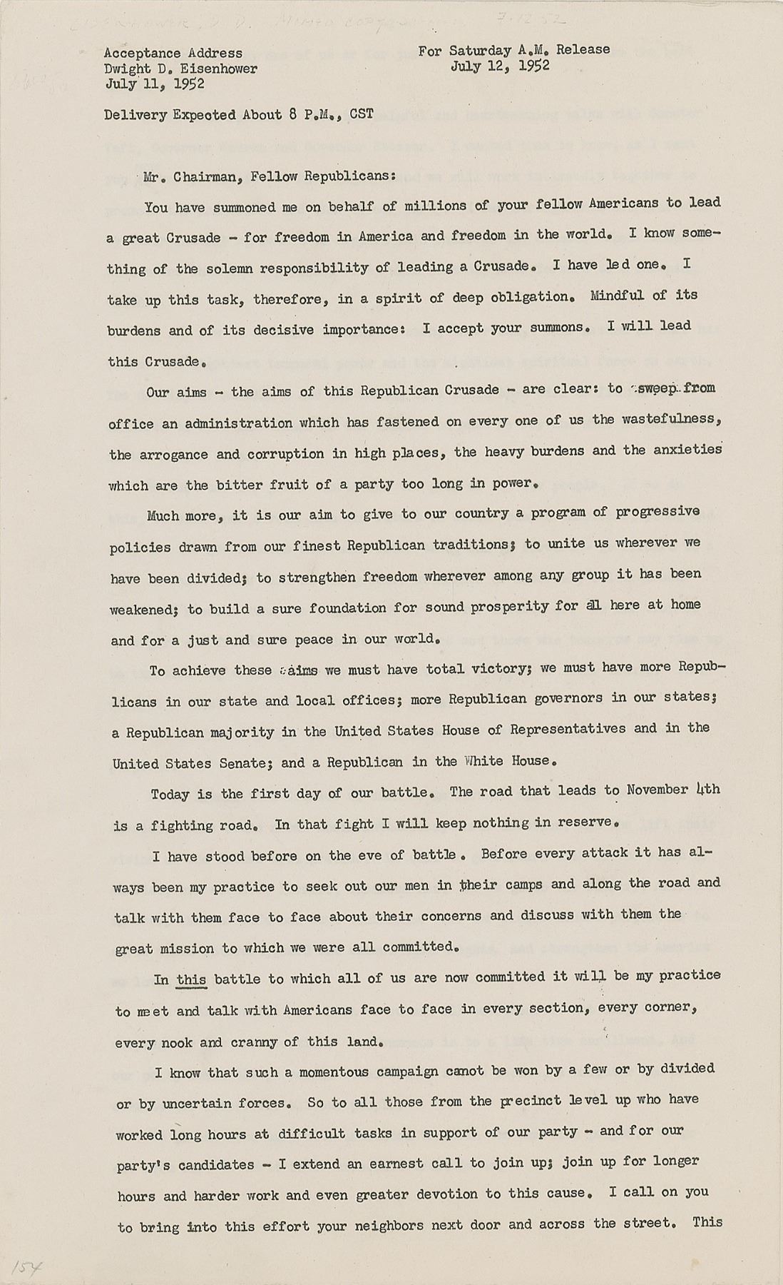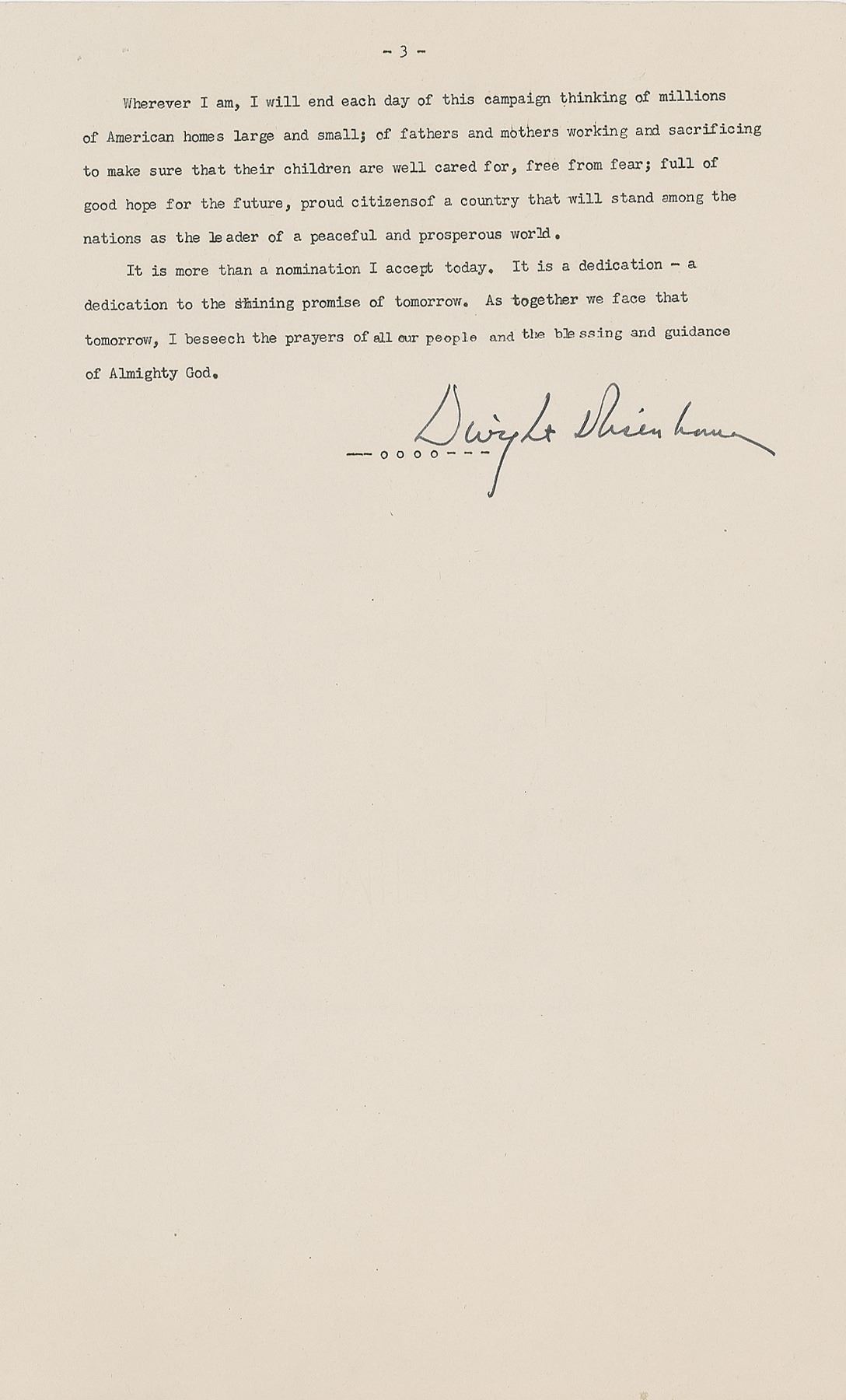 Scarce souvenir typescript of Dwight D. Eisenhower's "Acceptance Address" for the Presidential Nomination, given at the Republican National Convention in Chicago on July 11, 1952, three pages, 8.5 x 14, signed at the conclusion in black ink by Eisenhower. A portion of the speech is as follows: "You have summoned me on behalf of millions of your fellow Americans to lead a great Crusade—for freedom in America and freedom in the world. I know something of the solemn responsibility of leading a Crusade. I have led one. I take up this task, therefore, in a spirit of deep obligation. Mindful of its burdens and of its decisive importance: I accept your summons. I will lead this crusade…Today is the first day of our battle. The road that leads to Nov. 4th is a fighting road. In that fight I will keep nothing in reserve. I have stood before on the eve of battle. Before every attack it has always been my practice to seek out our men in their camps and along the road and talk with them face to face about their concerns and discuss with them the great mission to which we were all committed. In this battle to which all of us are now committed it will be my practice to meet and talk with Americans face to face in every section, every corner, every nook and cranny of this land…Wherever I am, I will end each day of this campaign thinking of millions of American homes large and small; of fathers and mothers working and sacrificing to make sure that their children are well cared for, free from fear; full of good hope for the future, proud citizens of a country that will stand among the nations as the leader of a peaceful and prosperous world. It is more than a nomination I accept today. It is a dedication—a dedication to the shining promise of tomorrow. As together we face that tomorrow, I beseech the prayers of all our people and the blessing and guidance of Almighty God." In fine condition.