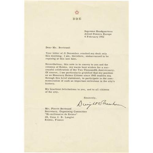 <B>President Dwight D. Eisenhower Typed Letter Signed with Great World War II Association.</B></I> TLS "<I>Dwight D. Eisenhower</B></I>" on his embossed five-star stationery, 1 page, "<I>Supreme Headquarters Allied Powers Europe</B></I>", Feb. 4, 1952, to Pierre Bertrand, Secretary of the Organizing Committee of the celebration of Reims' 2000th Anniversary. In part: "<I>...this note is to convey to you and the citizens of Reims, my warm best wishes for a successful celebration of the Two Thousandth Anniversary... I am particularly gratified that my position as an Honorary Reims Citizen since 1945 enables me... to participate in the commemoration of such an important milestone in the city's history.</B></I>" Eisenhower had been awarded an honorary citizenship on May 12, 1945, five days after the German unconditional surrender at the historic city. Light mail folds, otherwise near fine condition. <I>From the collection of Henry E. Luhrs</B></I><BR><BR><b>Shipping:</b> Flat Material, Small (<a target="_blank" href="http://www.heritageauctions.com/common/shipping.php">view shipping information</a>)