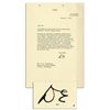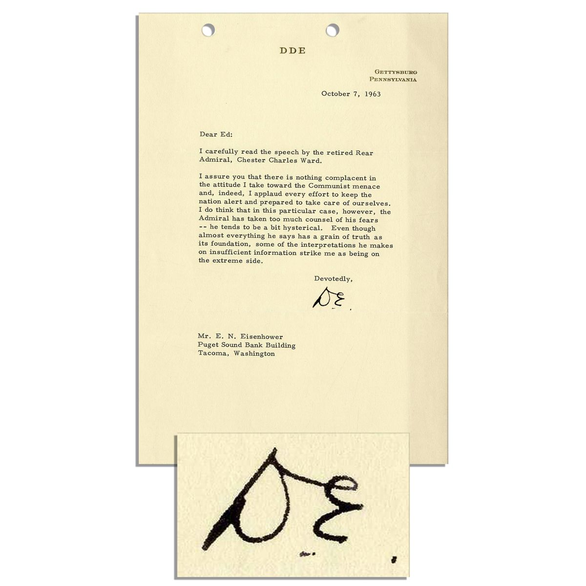 Dwight D. Eisenhower typed letter signed, dated 7 October 1963 on his personal stationery. Here, Eisenhower writes to his brother, Edgar, discussing a retired Rear Admiral, Chester Charles Ward, and his hysteria over Communism: ''...I assure you that there is nothing complacent in the attitude I take toward the Communist menace and, indeed, I applaud every effort to keep the nation alert and prepared to take care of ourselves. I do think that in this particular case, however, the Admiral has taken too much counsel of his fears -- he tends to be a bit hysterical. Even though almost everything he says has a grain of truth as its foundation, some of the interpretations he makes on insufficient information strike me as being on the extreme side. Devotedly, [signed] D.E.'' Letter measures 7'' x 10.25'' on one page with two holes punched at top and minor toning. Near fine condition.