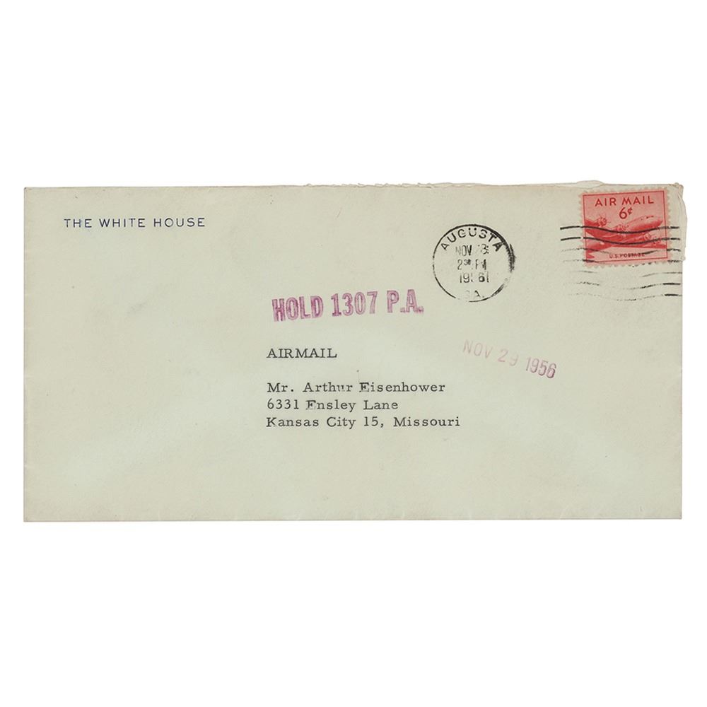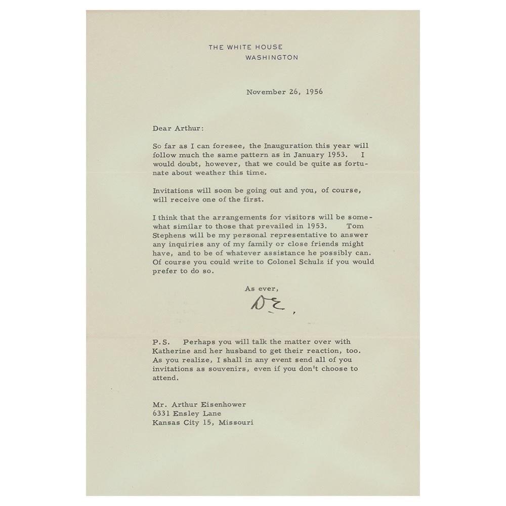 TLS as president signed “D.E.,†one page, 7 x 10.25, White House letterhead, November 26, 1956. Letter to his brother Arthur, inviting him to his second inauguration as president. In full: "So far as I can foresee, the Inauguration this year will follow much the same pattern as January 1953. I would doubt, however, that we could be quite as fortunate about weather this time. Invitations will soon be going out and you, of course, will receive one of the first. I think that the arrangements for visitors will be somewhat similar to those that prevailed in 1953. Tom Stephens will be my personal representative to answer any inquiries any of my family or close friends might have, and to be of whatever assistance he possibly can. Of course you could write to Colonel Schulz if you would prefer to do so." He adds a typed postscript: "Perhaps you will talk the matter over with Katherine and her husband to get their reaction, too. As you realize, I shall in any event send all of you invitations as souvenirs, even if you don't choose to attend." In fine condition. Accompanied by the original mailing envelope.