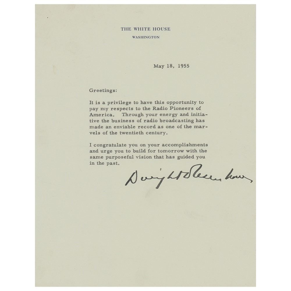 TLS as president, one page, 7 x 8.75, White House letterhead, May 18, 1955. Statement honoring the Radio Pioneers of America, in full: "It is a privilege to have this opportunity to pay my respects to the Radio Pioneers of America. Through your energy and initiative the business of radio broadcasting has made an enviable record as one of the marvels of the twentieth century. I congratulate you on your accomplishments and urge you to build for tomorrow with the same purposeful vision that has guided you in the past." In very fine condition.
