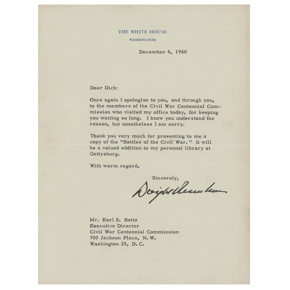 TLS as president, one page, 6.75 x 8.75, White House letterhead, December 6, 1960. Letter to Karl S. Betts, executive director of the Civil War Centennial Commission. In full: "Once again I apologize to you, and through you, to the members of the Civil War Centennial Commission who visited my office today, for keeping you waiting so long. I know you understand the reason, but nonetheless I am sorry. Thank you very much for presenting to me a copy of the 'Battles of the Civil War.' It will be a valued addition to my personal library at Gettysburg." In fine condition.