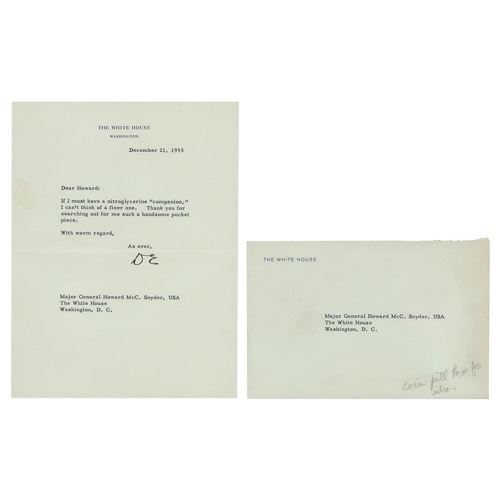 TLS as president signed ‰ÛÏD.E.,‰Û one page, 6.75 x 8.75, White House letterhead, December 21, 1955. Letter to Physician to the President Howard McCrum Snyder, in full: "If I must have nitroglycerine 'companion,' I can't think of a finer one. Thank you for searching out for me such a handsome pocket piece." In fine condition. Accompanied by an official White House transmittal envelope addressed to Snyder.