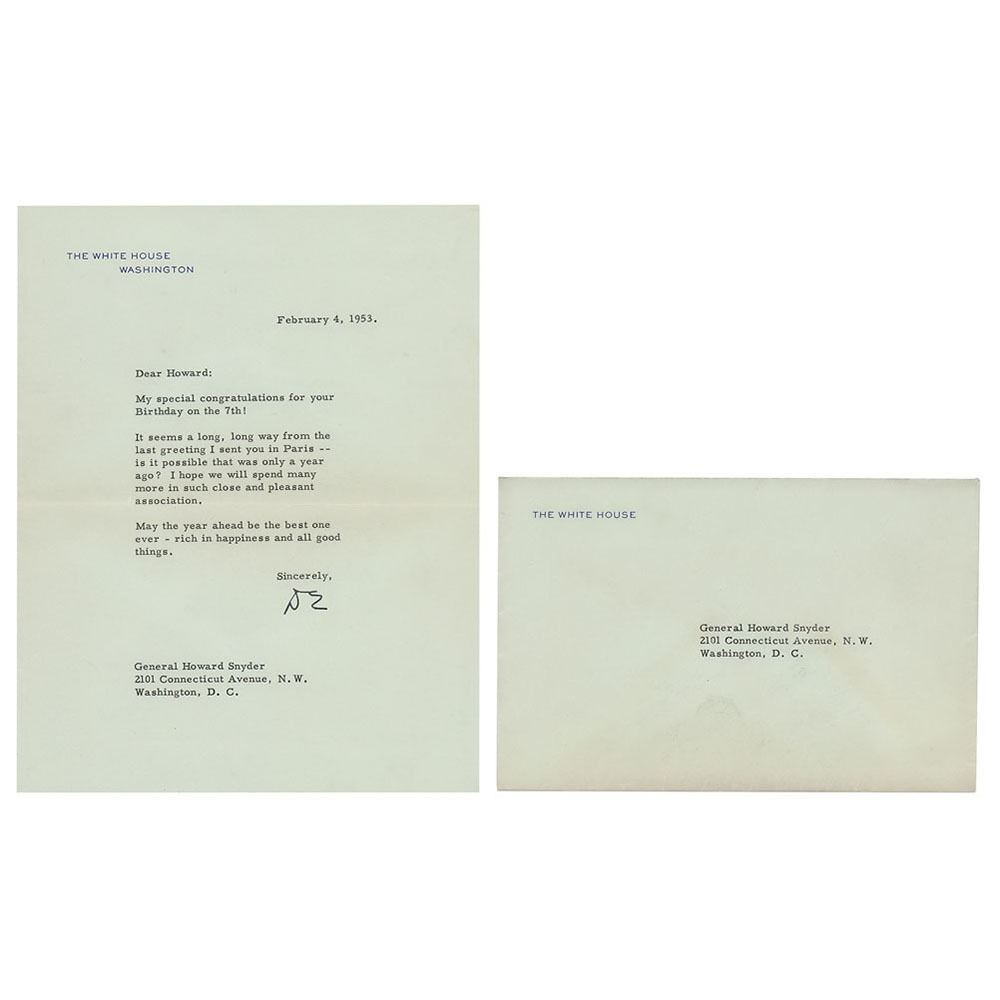 TLS as president signed “D.E.,†one page, 7 x 8.75, White House letterhead, February 4, 1953. Letter to Physician to the President Howard McCrum Snyder, in part: "My special congratulations for your Birthday on the 7th! It seems a long, long way from the last greeting I sent you in Paris—is it possible that was only a year ago? I hope we will spend many more in such close and pleasant association." In fine condition. Accompanied by an official White House transmittal envelope addressed to Snyder.