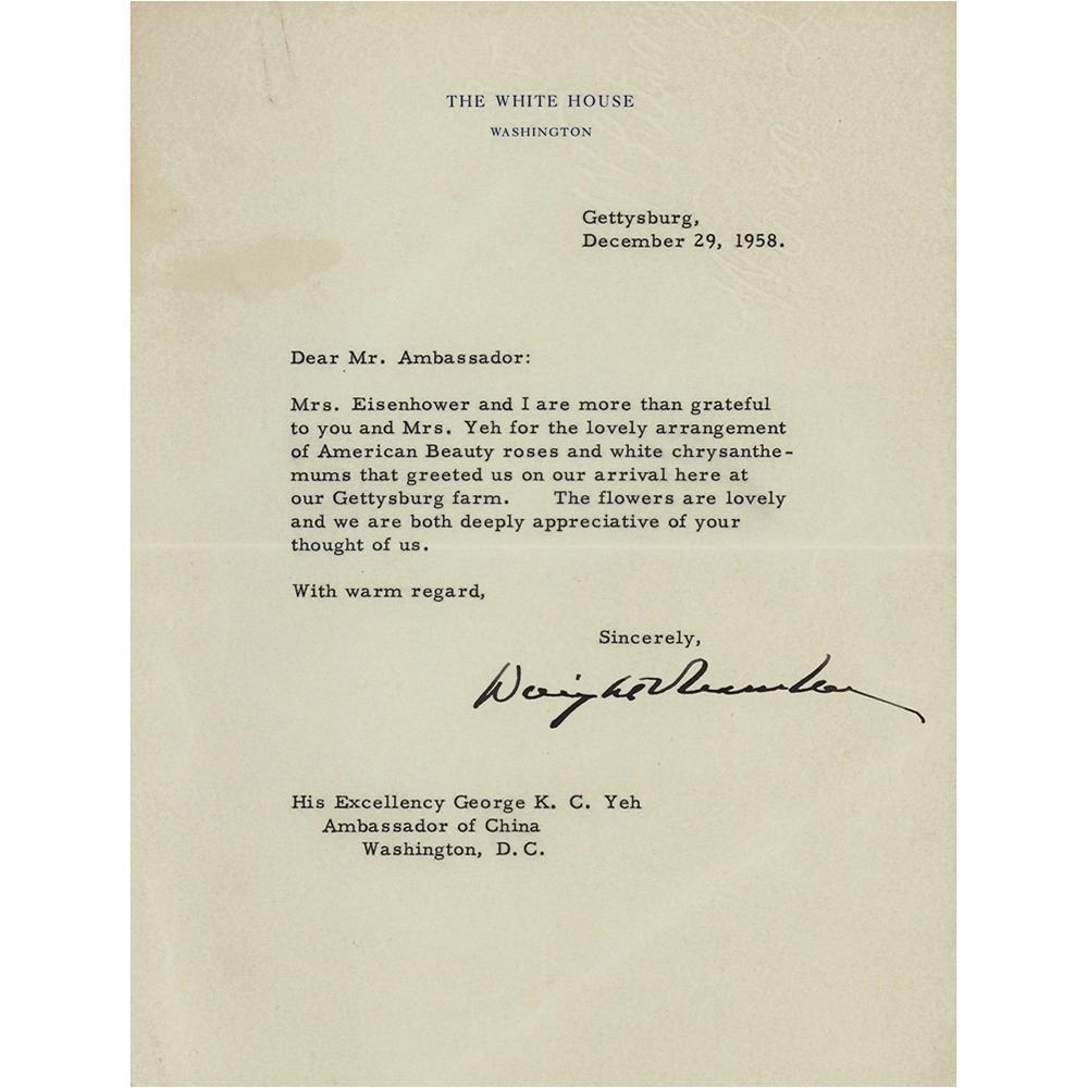 TLS as president, one page, 6.75 x 8.75, White House letterhead, December 29, 1958. Letter to George K. C. Yeh, ambassador of the Republic of China to the United States. In full: "Mrs. Eisenhower and I are more than grateful to you and Mrs. Yeh for the lovely arrangement of American Beauty roses and white chrysanthemums that greeted us on our arrival here at our Gettysburg farm The flowers are lovely and we are both deeply appreciative of your thought of us." In very good to fine condition, with a faint stain, a light bend to the lower right corner, and a paperclip impression to the top edge. Accompanied by the original White House transmittal envelope.