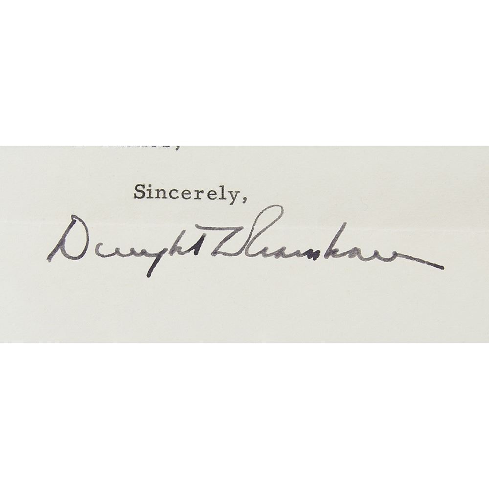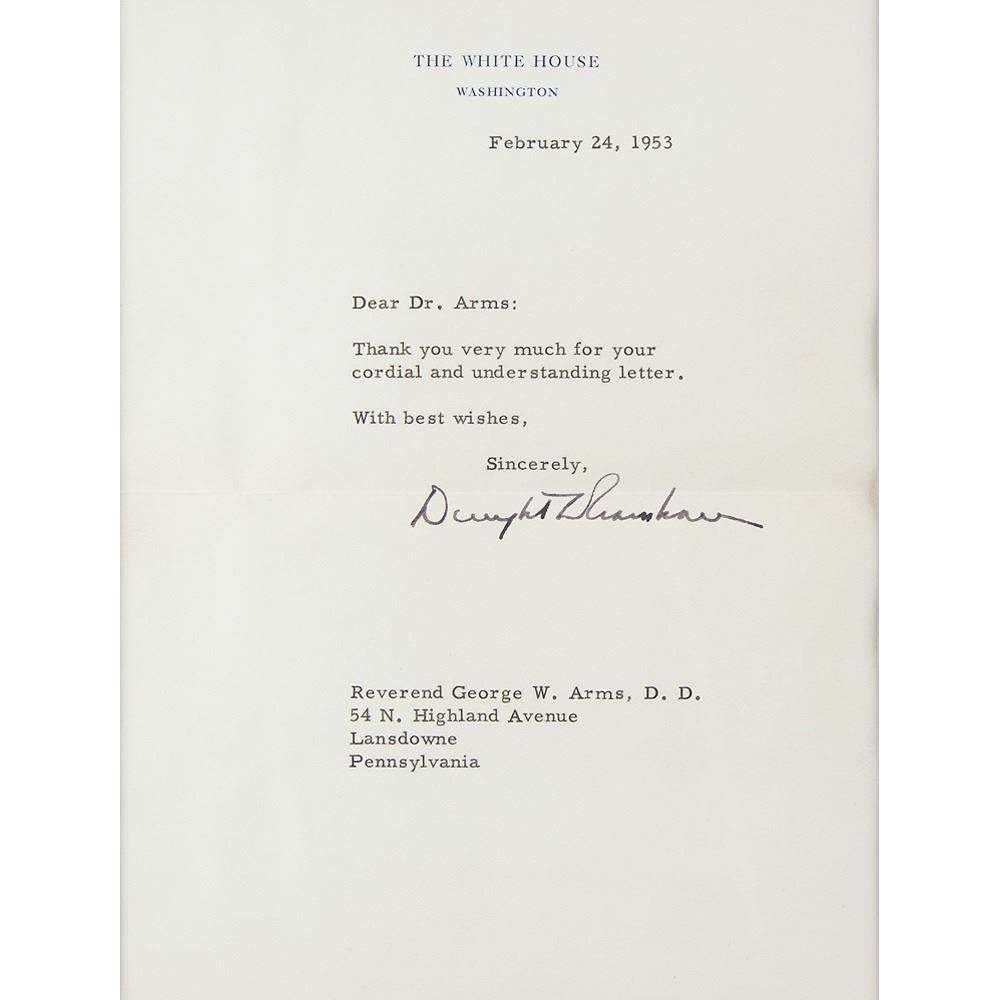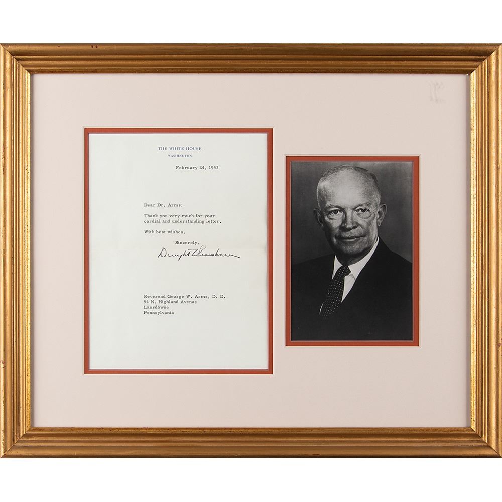 TLS as president, one page, 6.25 x 8.25, White House letterhead, February 24, 1953. Letter to Reverend George W. Arms, in full: "Thank you very much for your cordial and understanding letter." Nicely double-matted and framed with a portrait to an overall size of 17.75 x 14.5. In fine condition. Accompanied by the original mailing envelope.