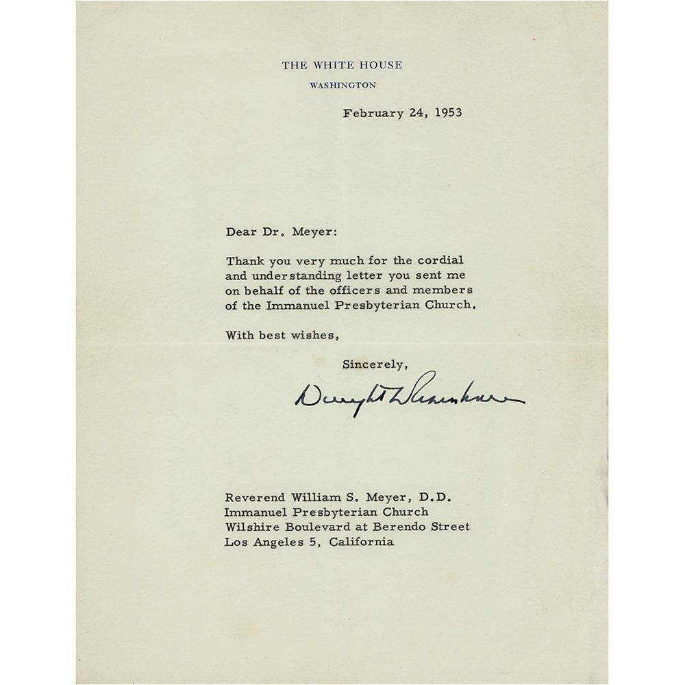 TLS as president, one page, 6.75 x 8.75, White House letterhead, February 24, 1953. Letter to Reverend William S. Meyer, in full: "Thank you very much for the cordial and understanding letter you sent me on behalf of the officers and members of the Immanuel Presbyterian Church." In very good to fine condition, with some light creasing, and a faint vertical fold. An early letter from Eisenhower written just a month into his presidency.