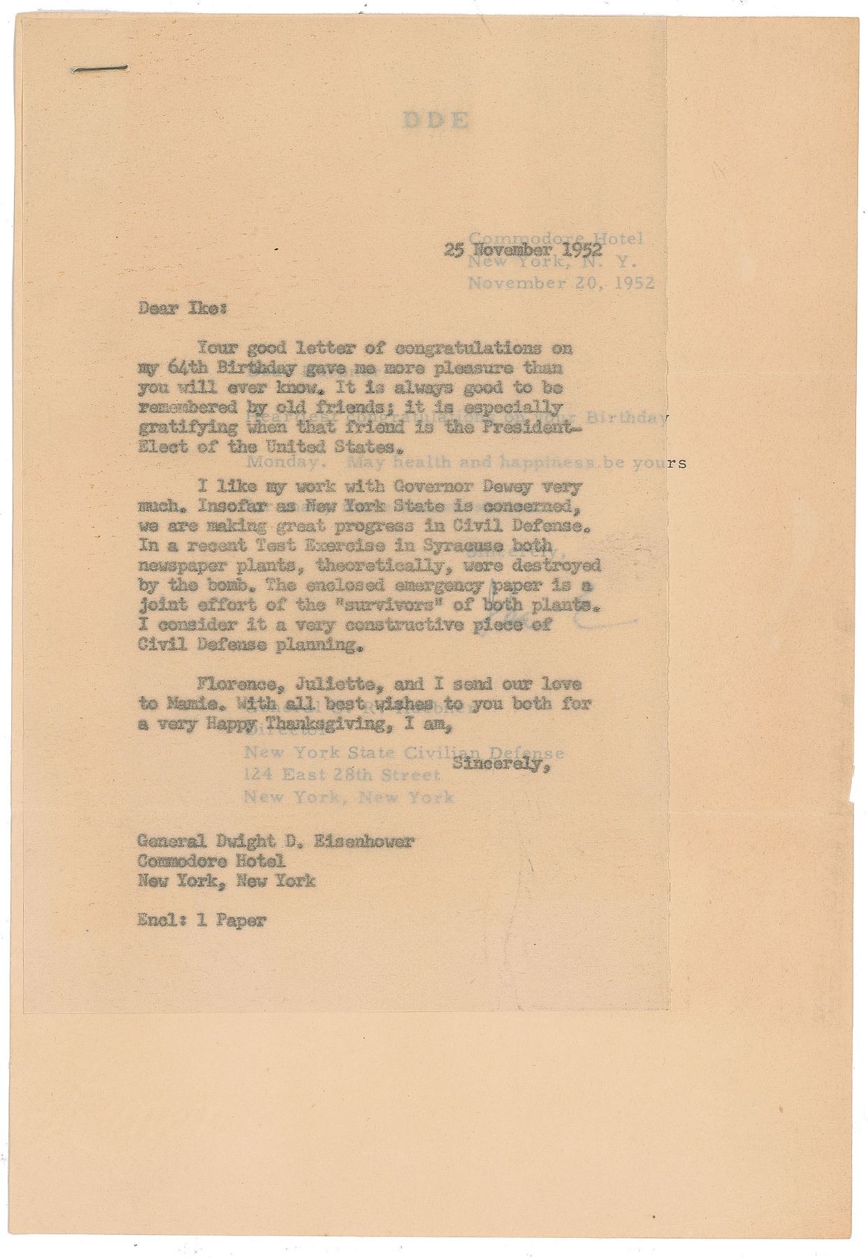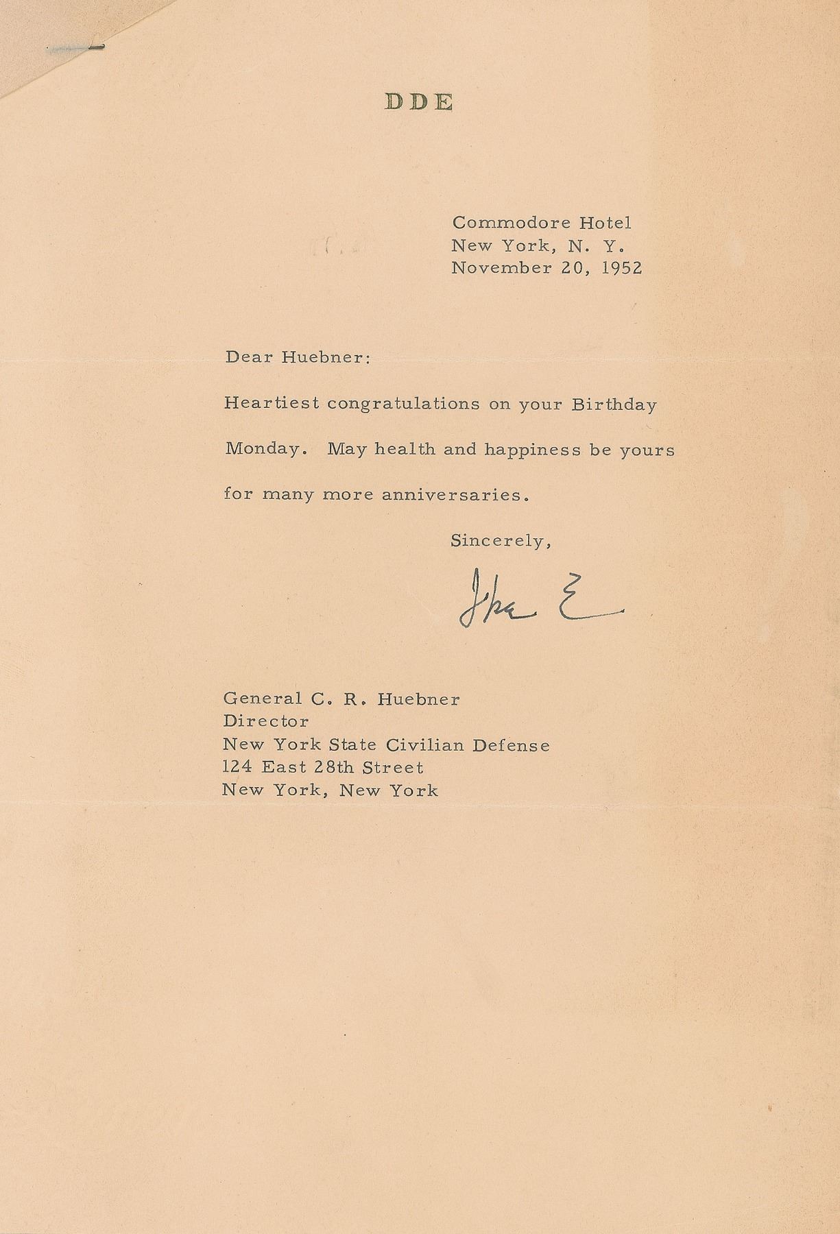 TLS as president-elect, signed “Ike E.,” one page, 7 x 10.25, personal letterhead, November 20, 1952. Letter to General C. R. Huebner, director of the New York State Civilian Defense. In full: "Heartiest congratulations on your Birthday Monday. May health and happiness be yours for many more anniversaries." A carbon copy of Huebner's response is stapled to the front, noting that they "are making great progress in Civil Defense." In very good to fine condition, with light, slightly irregular toning, and a carbon of the recipient's letter to Eisenhower stapled to the upper left corner.