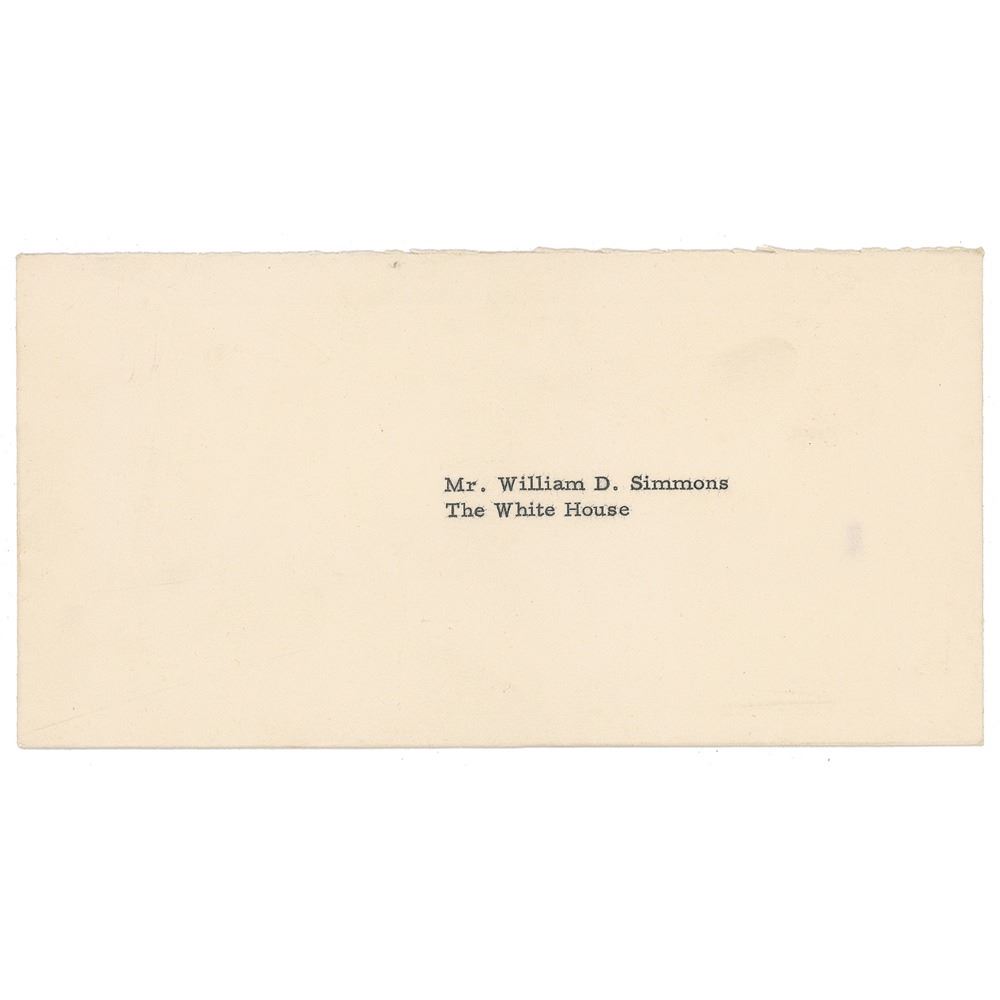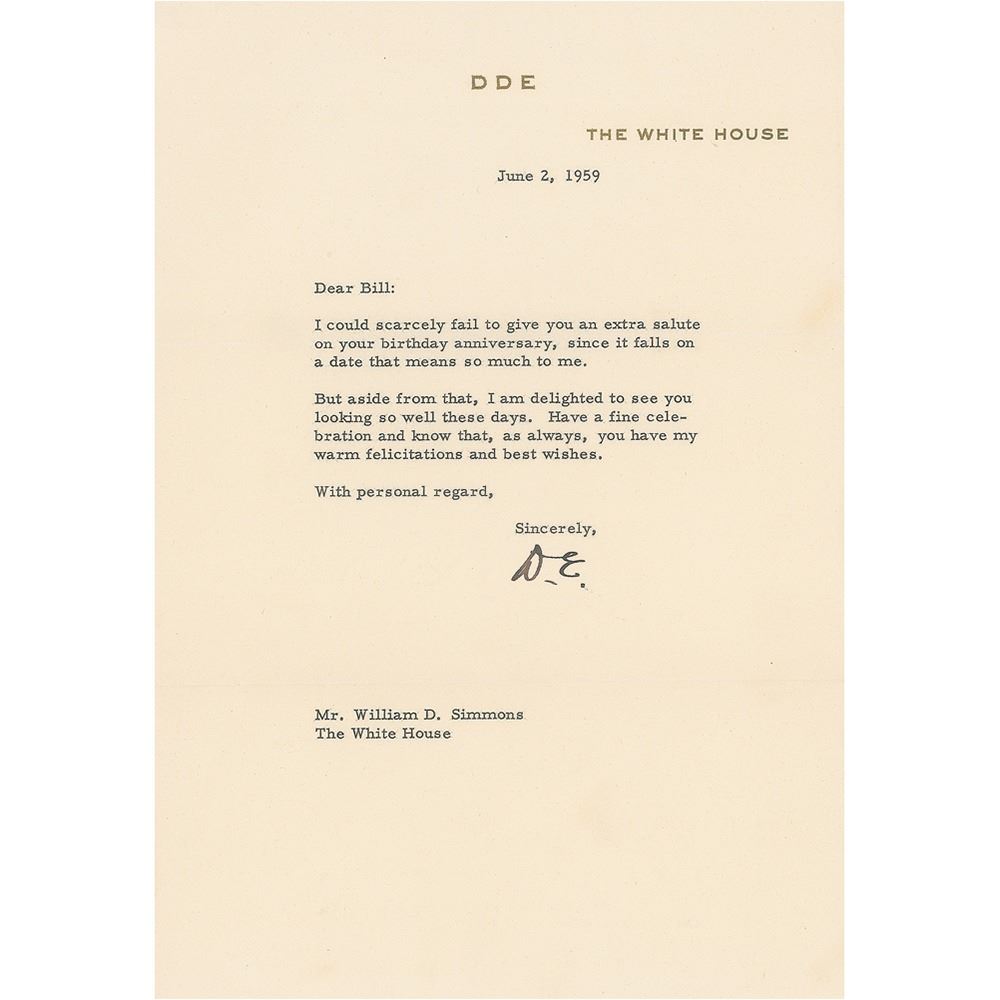 TLS as president, signed "D. E.," one page, 7.25 x 10.5, White House letterhead, June 2, 1959. Eisenhower sends birthday wishes to William D. Simmons. In part: "I could scarcely fail to give you an extra salute on your birthday anniversary, since it falls on a date that means so much to me." In fine condition. Accompanied by the original envelope.