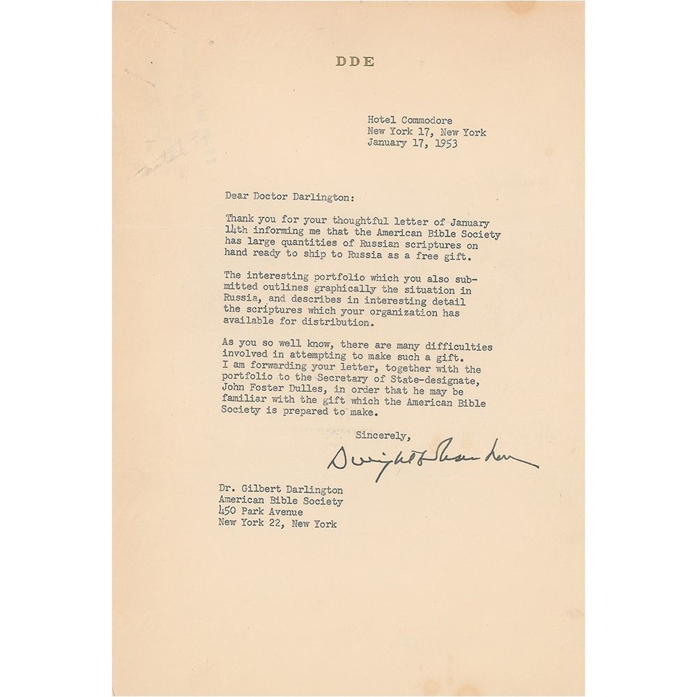 TLS, one page, 7 x 10.25, personal letterhead, January 17, 1953. Letter to Dr. Gilbert Darlington of the American Bible Society, written three days before his inauguration as president. In full: "Thank you for your thoughtful letter of January 14th informing me that the American Bible Society has large quantities of Russian scriptures on hand ready to ship to Russia as a free gift. The interesting portfolio which you also submitted outlines graphically the situation in Russia, and describes in interesting detail the scriptures which your organization has available for distribution. As you so well know, there are many difficulties involved in attempting to make such a gift. I am forwarding your letter, together with the portfolio to the Secretary of State-designate, John Foster Dulles, in order that he may be familiar with the gift which the American Bible Society is prepared to make." In fine condition, with staple holes to the upper left corner, and small stains to the bottom edge.