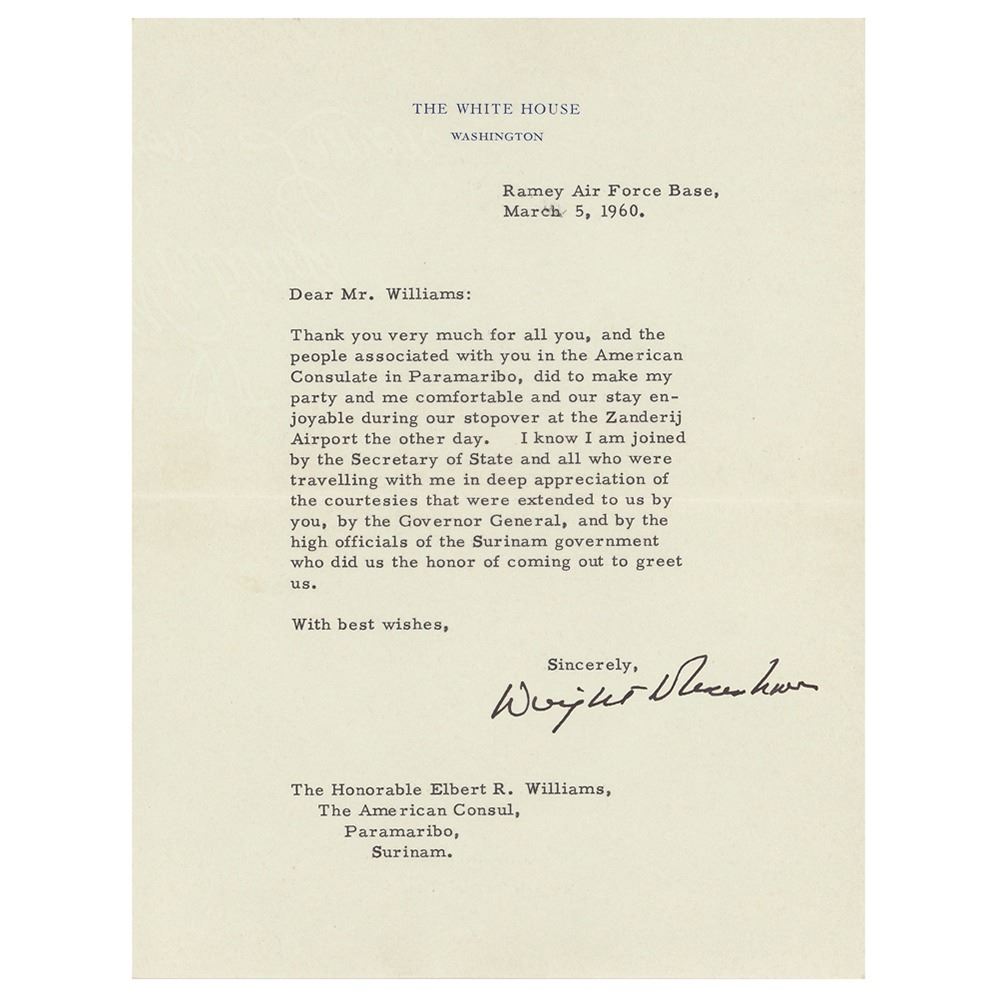 TLS as president, one page, 6.75 x 8.75, White House letterhead, March 5, 1960. Letter to Elbert R. Williams at the American Consul in Paramaribo, Suriname, in full: "Thank you very much for all you, and the people associated with you in the American Consulate in Paramaribo, did to make my party and me comfortable and our stay enjoyable during our stopover at the Zanderij Airport the other day. I know I am joined by the Secretary of State and all who were travelling with me in deep appreciation of the courtesies that were extended to us by you, by the Governor General, and by the high officials of the Surinam government who did us the honor of coming out to greet us." In fine condition. Accompanied by the White House mailing envelope.