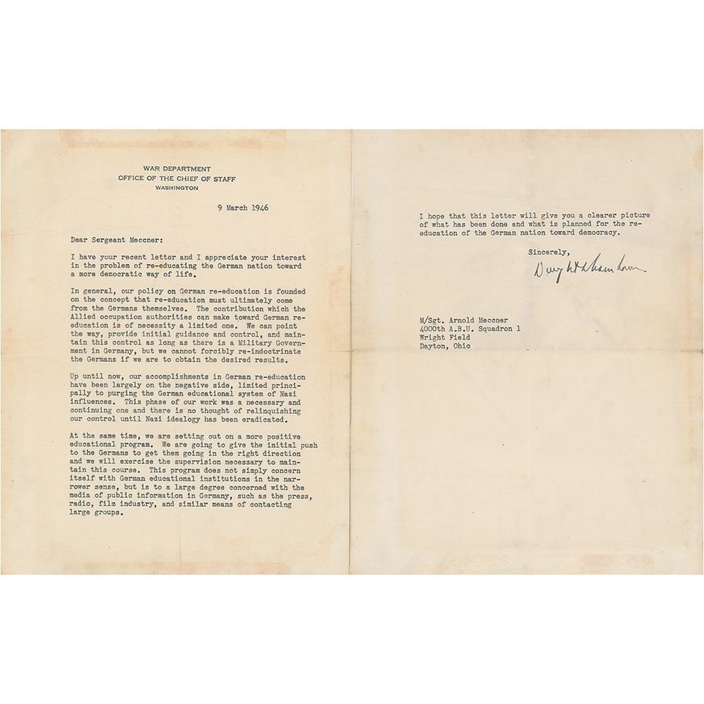 TLS, two pages, 7 x 9, War Department, Office of the Chief of Staff letterhead, March 9, 1946. Letter to Master Sergeant Arnold Meccner, in full: "I have you recent letter and I appreciate your interest in the problem of re-educating the German nation toward a more democratic way of life. In general, our policy on German re-education is founded on the concept that re-education must ultimately come from the Germans themselves. The contribution which the Allied occupation authorities can make toward German re-education is of necessity a limited one. We can point the way, provide initial guidance and control, and maintain this control as long as there is a Military Government in Germany, but we cannot forcibly re-indoctrinate the Germans if we are to obtain the desired results.