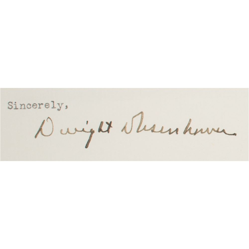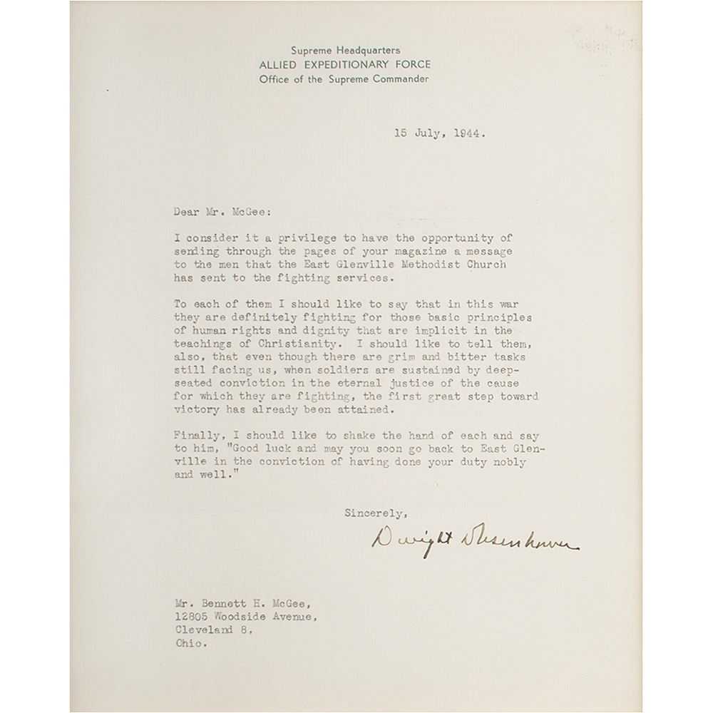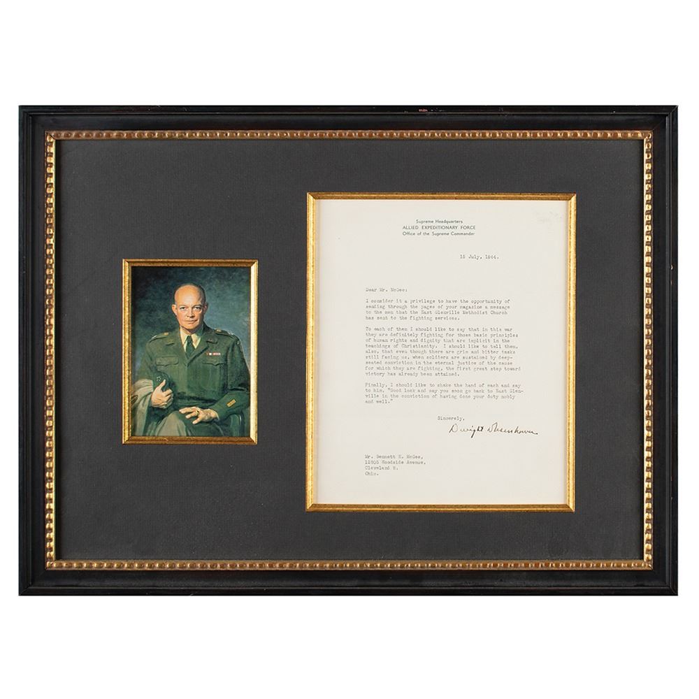 World War II-dated TLS, one page, 7.5 x 9, personal Supreme Headquarters, Allied Expeditionary Force letterhead, July 15, 1944. Letter to Bennett H. McGee, in full: "I consider it a privilege to have the opportunity of sending through the pages of your magazine a message to the men that the East Glenville Methodist Church has sent to the fighting services. To each of them I should like to say that in this war they are definitely fighting for those basic principles of human rights and dignity that are implicit in the teachings of Christianity. I should like to tell them, also, that even though there are grim and bitter tasks still facing us, when soldiers are sustained by deep-seated conviction in the eternal justice of the cause for which they are fighting, the first great step toward victory has already been attained. Finally, I should like to shake the hand of each and say to him, 'Good luck and may you soon go back to East Glenville in the conviction of having done your duty nobly and well.'" Handsomely matted and framed with a portrait of Ike in uniform to an overall size of 19.75 x 14.5. In fine condition.
