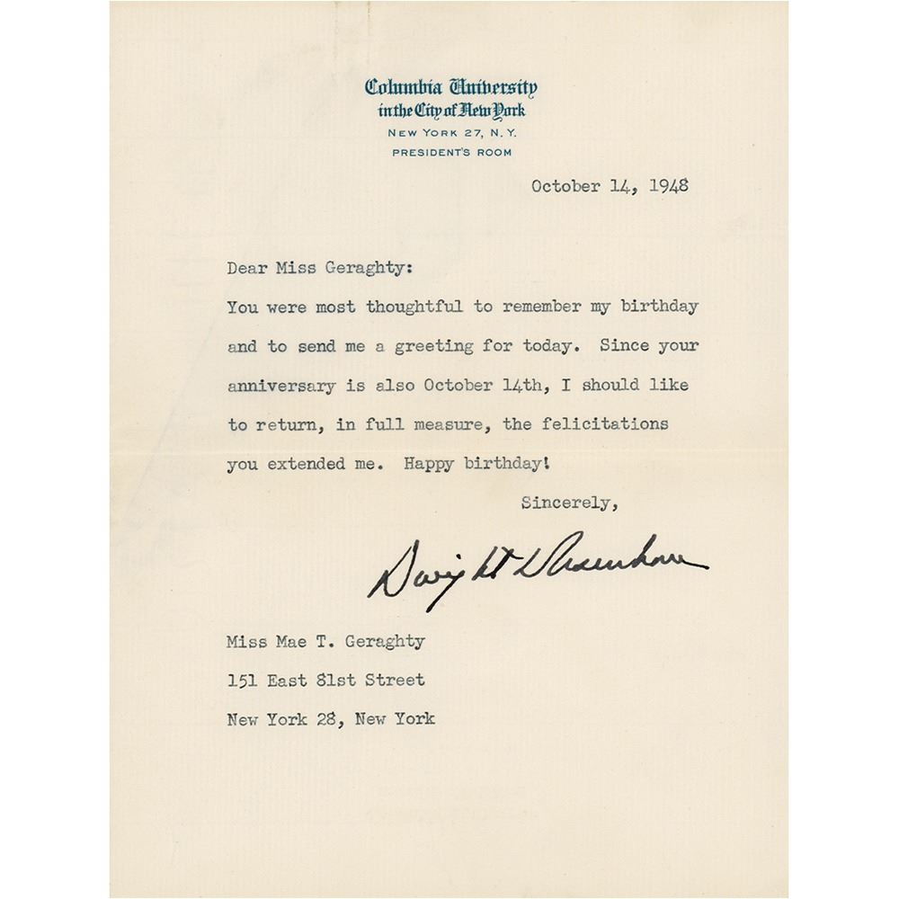 TLS, one page, 5.75 x 7.75, Columbia University letterhead, October 14, 1948. Letter to Miss Mae T. Geraghty, in full: "You were most thoughtful to remember my birthday and to send me a greeting for today. Since your anniversary is also October 14th, I should like to return, in full measure, the felicitations you extended me. Happy birthday!" In fine condition, with a faint paperclip impression to the top edge. Eisenhower served as president of Columbia University from 1948"“1953.