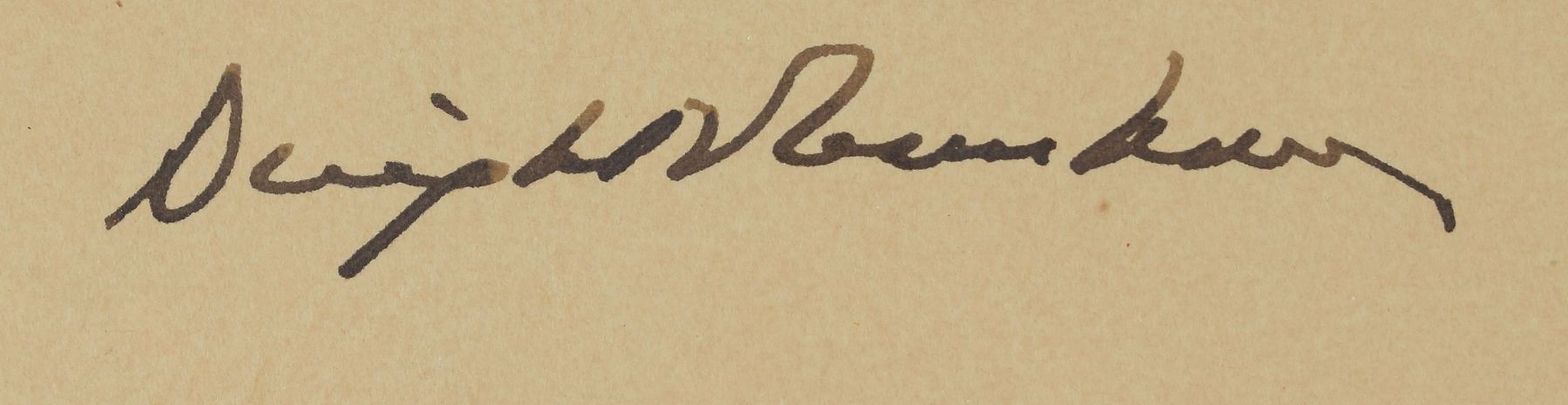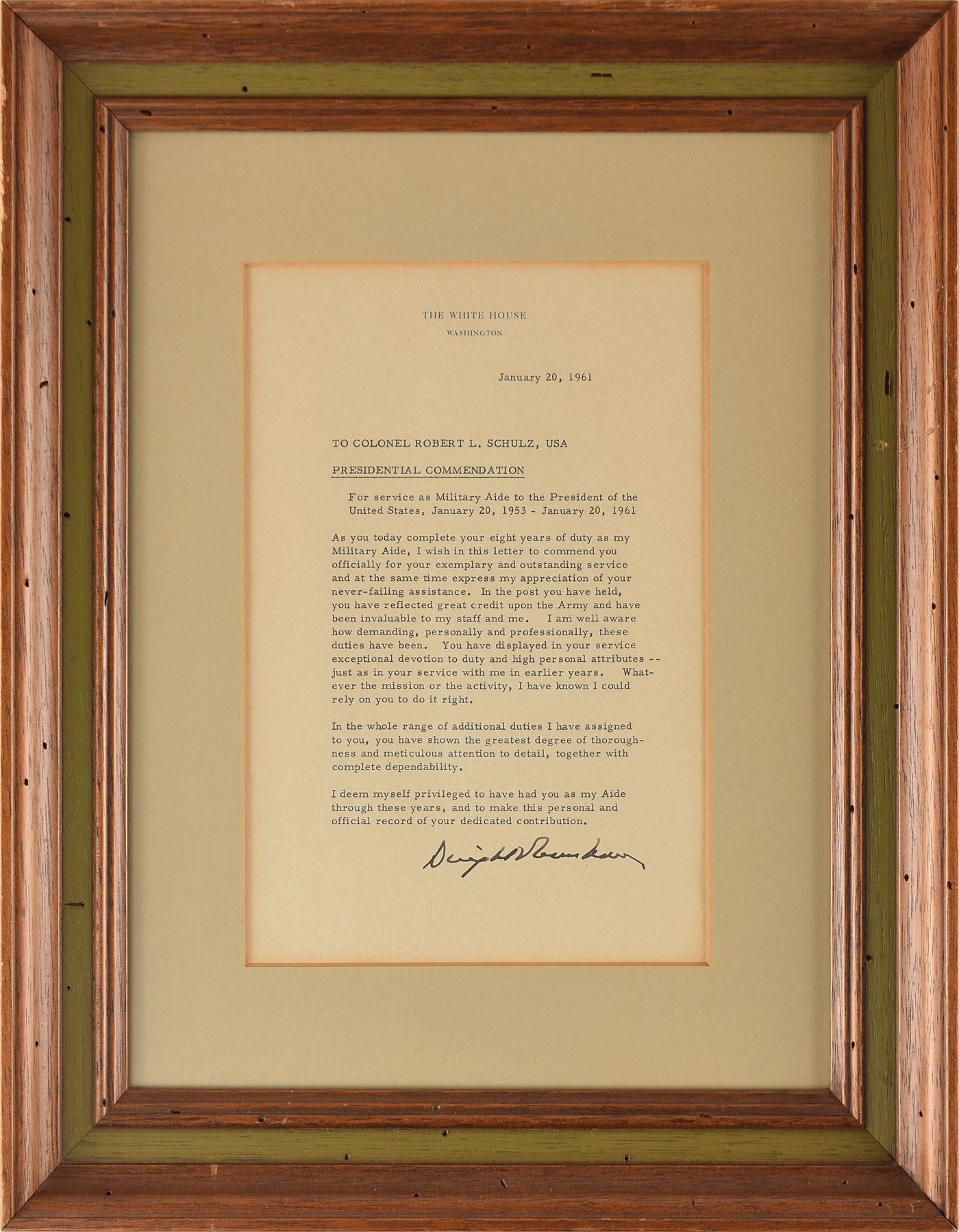 TLS as president, one page, 7 x 10, White House letterhead, January 20, 1961. Historic presidential commendation "for service as Military Aide to the President of the United States, January 20, 1953–January 20, 1961," issued to Colonel Robert L. Schulz on President Dwight D. Eisenhower's very last day in office. In full: "As you today complete your eight years of duty as my Military Aide, I wish in this letter to commend you officially for your exemplary and outstanding service and at the same time express my appreciation of your never-failing assistance. In the post you have held, you have reflected great credit upon the Army and have been invaluable to my staff and me. I am well aware how demanding, personally and professionally, these duties have been. You have displayed in your service exceptional devotion to duty and high personal attributes—just as in your service with me in earlier years. Whatever the mission or the activity, I have known I could rely on you to do it right. In the whole range of additional duties I have assigned to you, you have shown the greatest degree of thoroughness and meticulous attention to detail, together with complete dependability. I deem myself privileged to have had you as my Aide through these years, and to make this personal and official record of your dedicated contribution." Matted and framed to an overall size of 14 x 17. In fine condition, with light uniform toning.