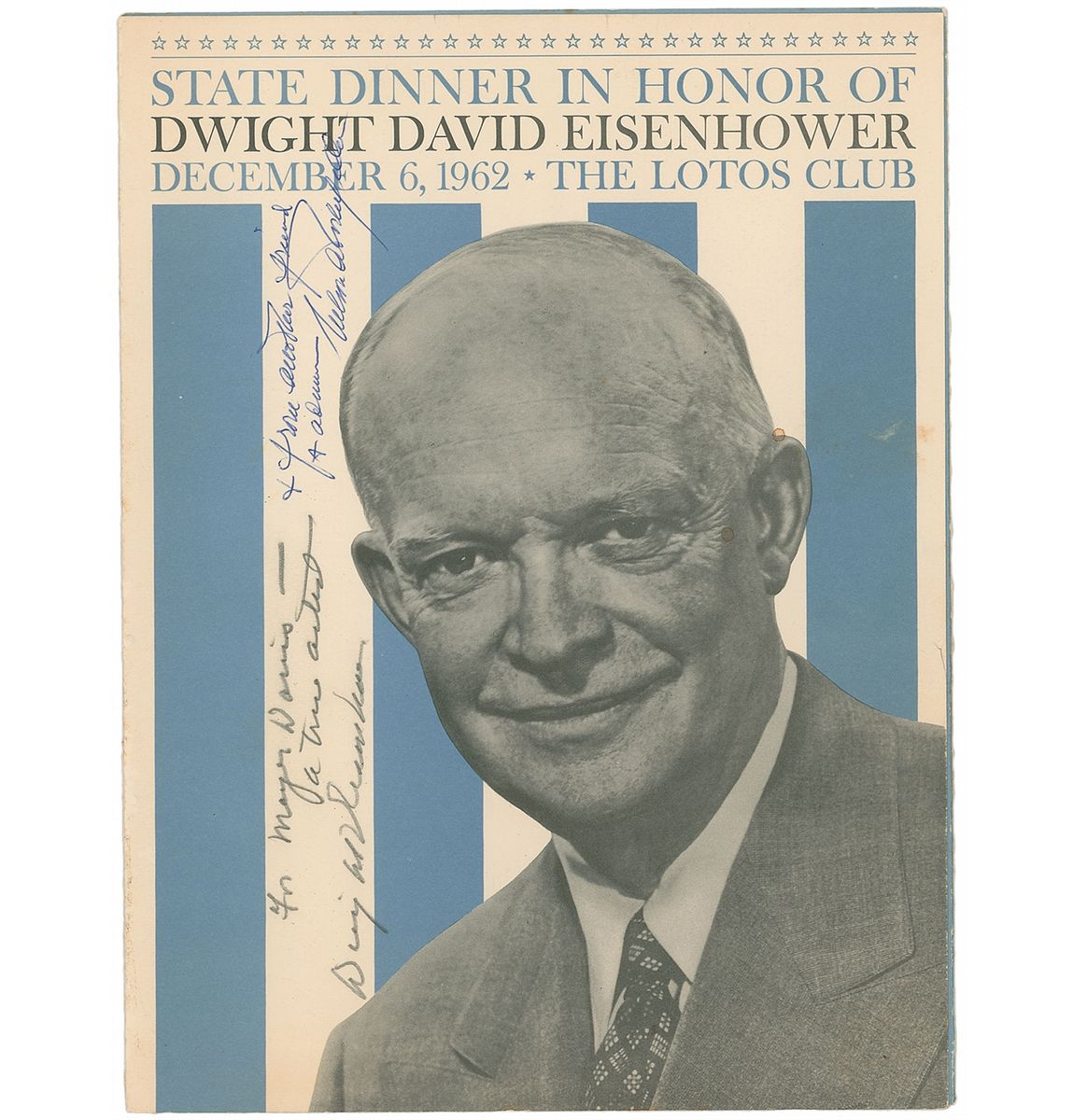 Tri-fold program from the state dinner in honor of Eisenhower, given by the Lotus Club on December 6, 1962, 9 x 12. Signed and inscribed vertically in pencil on the front cover, “For Mayor Davis—a true artist, Dwight D. Eisenhower,” and in blue ballpoint, “& from another friend & alum, Nelson Rockefeller.” In fine condition.