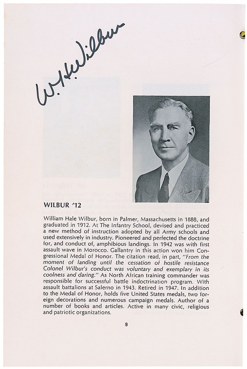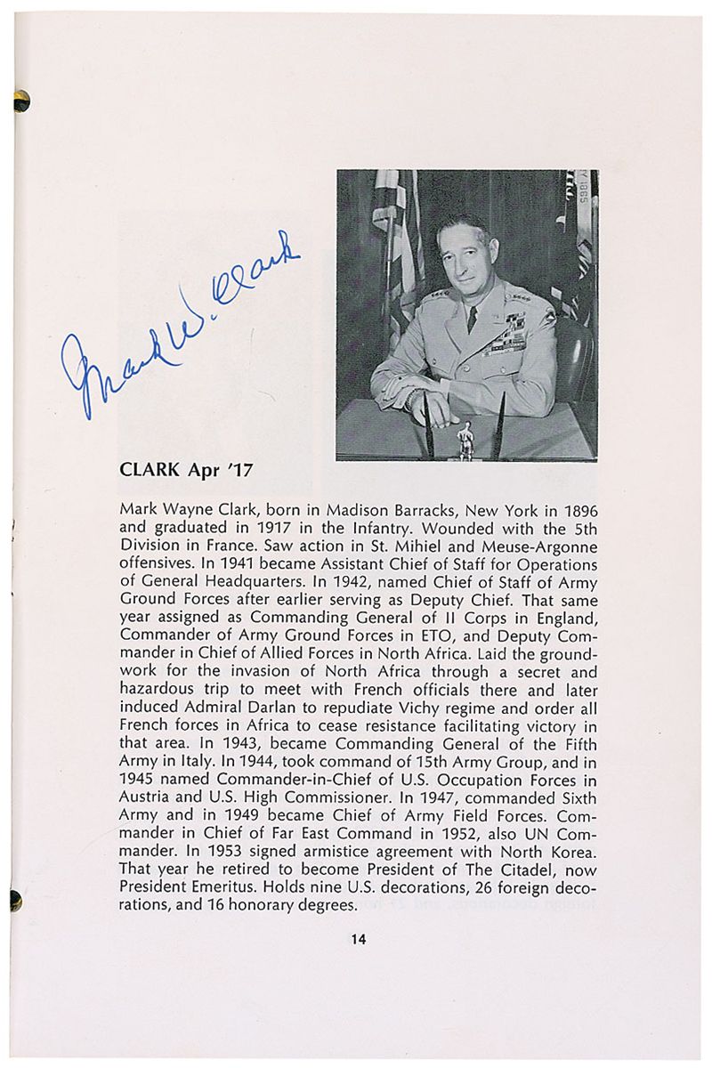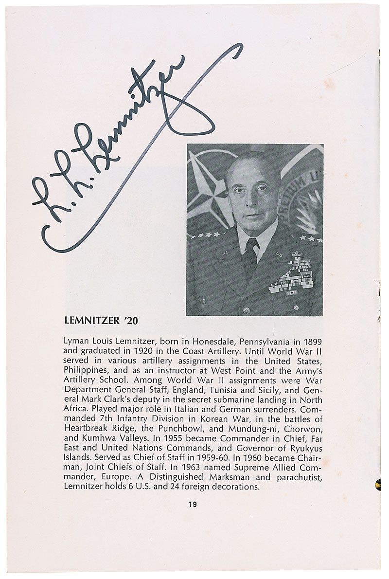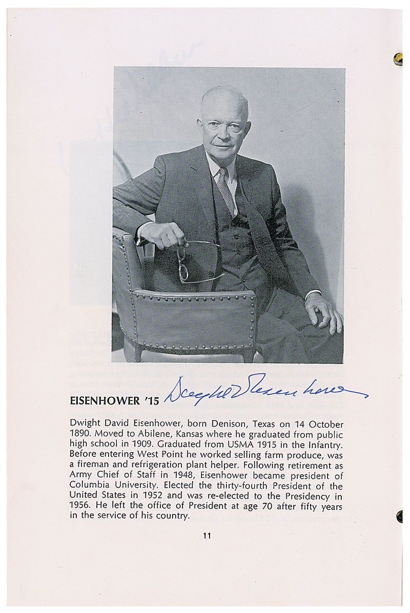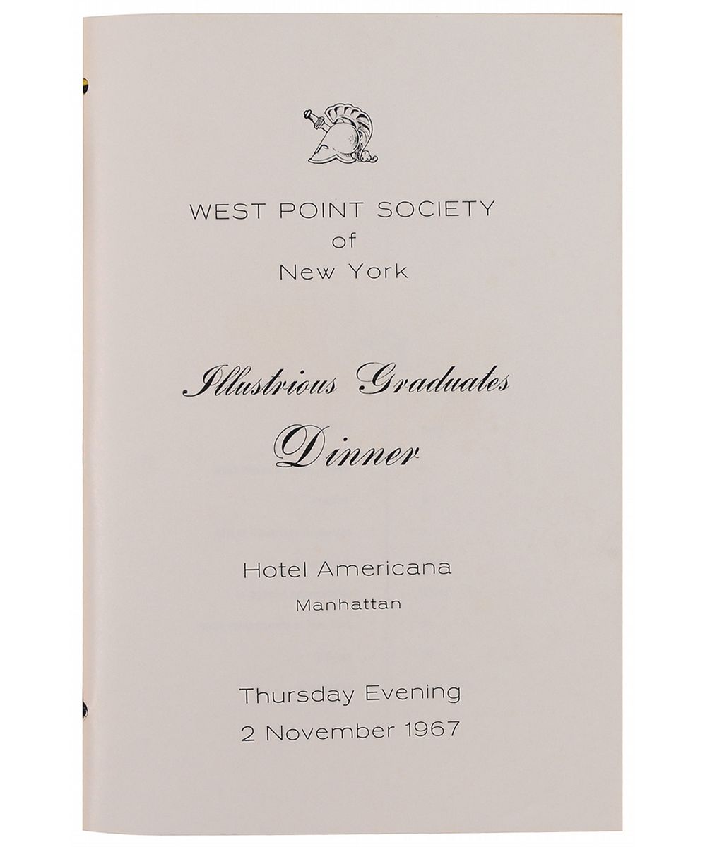Program for the Illustrious Graduates Dinner of the West Point Society of New York, November 2, 1967, 7 x 10, 37 pages, signed inside in ballpoint and felt tip by Dwight D. Eisenhower, Mark W. Clark, Lyman Lemnitzer, William H. Wilbur, and Lauris Norstad. In fine condition, with light scattered foxing and soiling to covers; some pages throughout exhibit slight foxing, but Eisenhower’s page is in very fine condition. Accompanied by the original ticket to the dinner, a seating chart, and an unsigned glossy press photo of Eisenhower at the event.