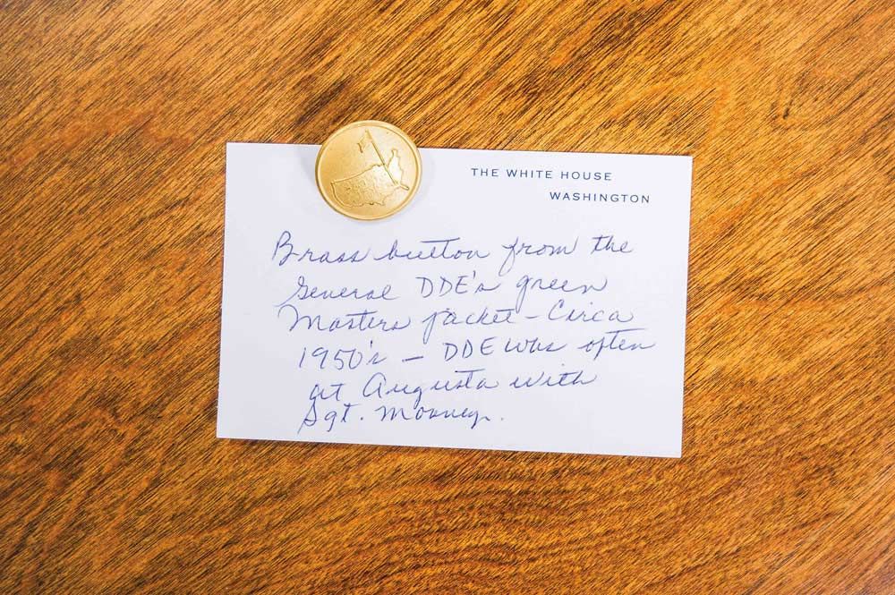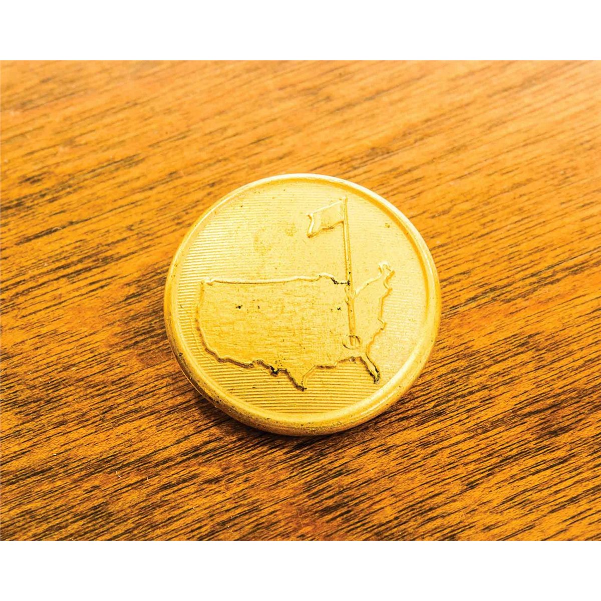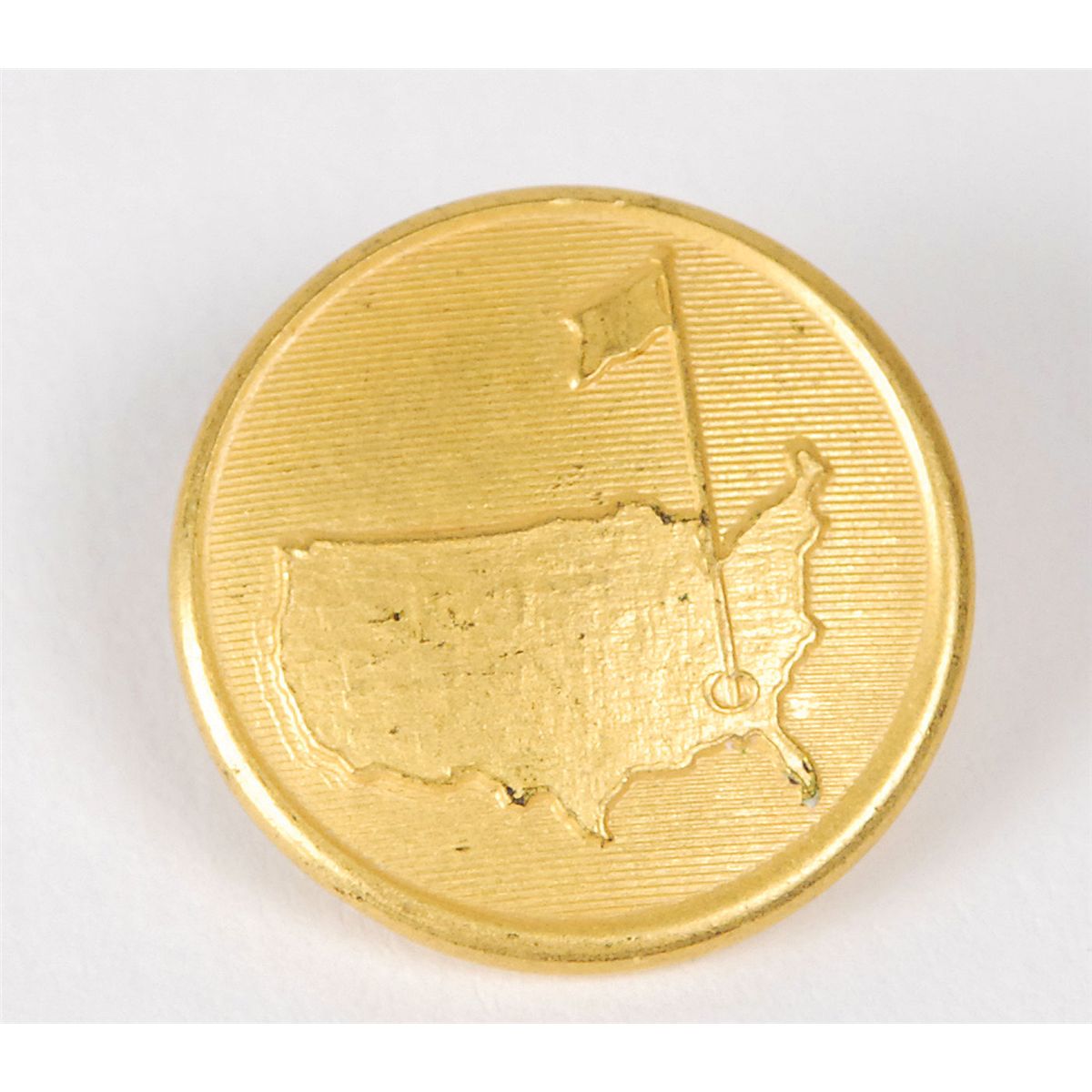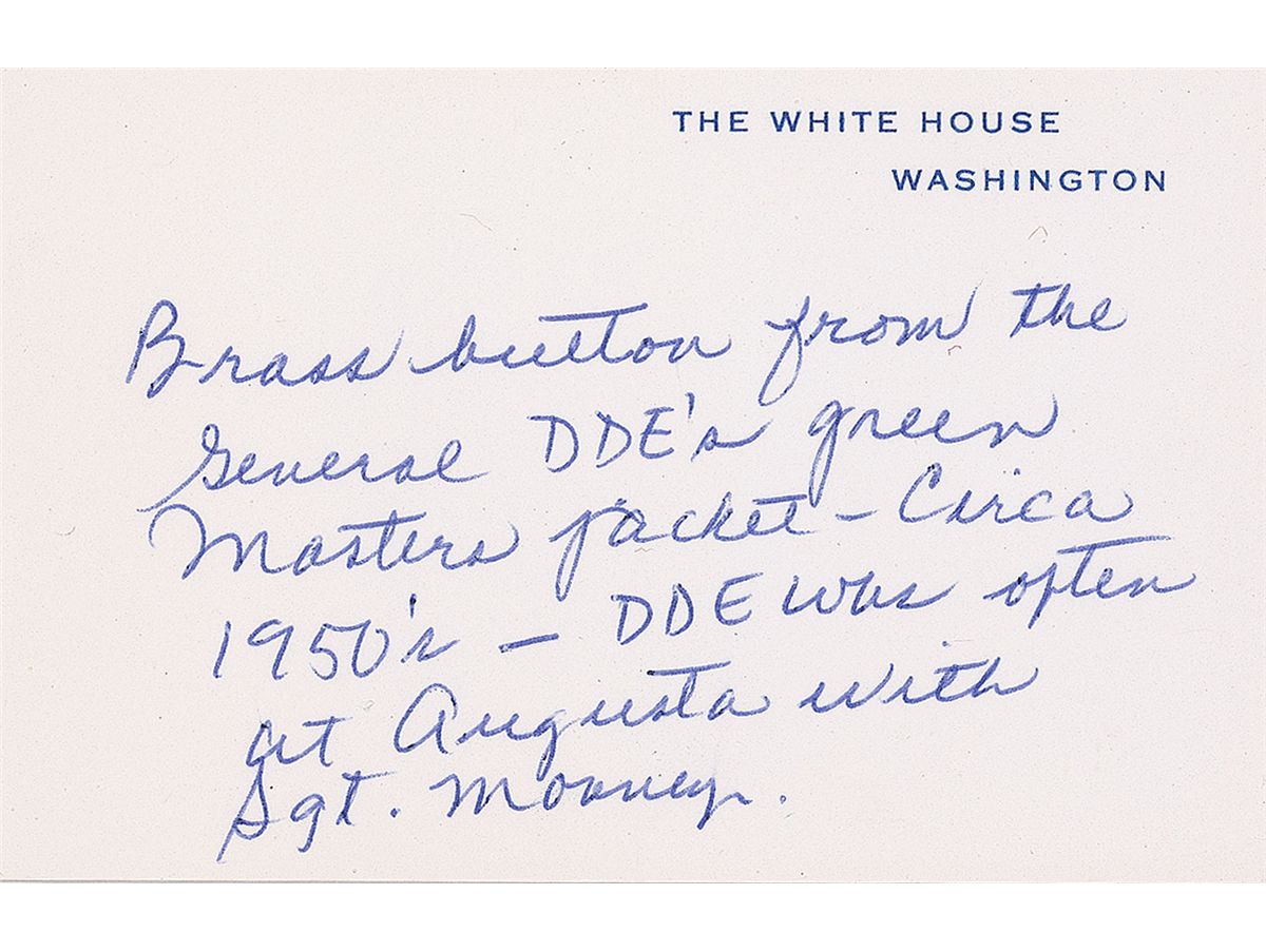 Brass button from Dwight D. Eisenhower’s personally-owned and -worn green Masters Tournament jacket, circa 1950s, measuring just under 1? in diameter. The button was manufactured by the Waterbury Button Company and features the Augusta National Golf Club logo in the center. Originates from the collection of Sgt. John Moaney, who served as Ike’s close personal valet from 1942 until the president's death in 1969, and includes two invitations with scheduling details for President Eisenhower’s flights from Washington to Augusta, Georgia, one for Sgt. John Moaney dated 1958 and one for Delores Moaney dated 1954. Also accompanied by three photos from the period, one showing President Eisenhower with Sgt. John Moaney on a bench at the exclusive golf club (picturing Ike wearing the green Master’s jacket that this button originated from) one showing Sgt. Moaney assisting President Eisenhower with his shoes, and one of the main building. Dwight D. Eisenhower was an avid golfer and frequented Augusta—the historic home of the Master’s—one of the course’s iconic features is known as the ‘Eisenhower Tree,’ a loblolly pine that the president unsuccessfully lobbied to have taken down because it interfered with his golf game.