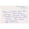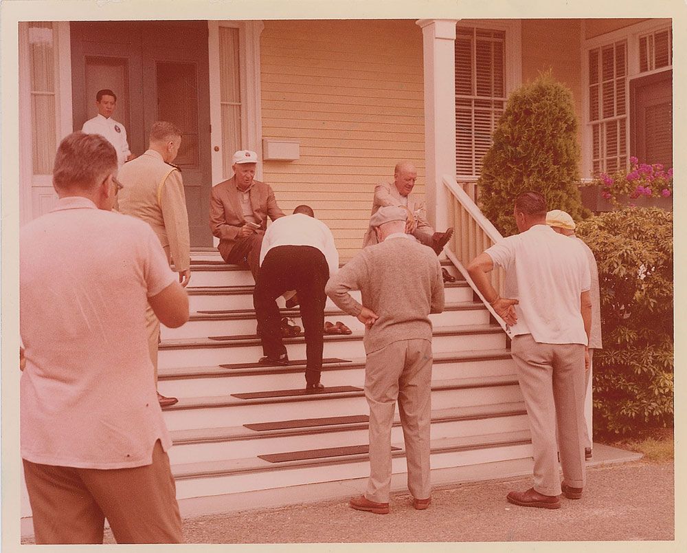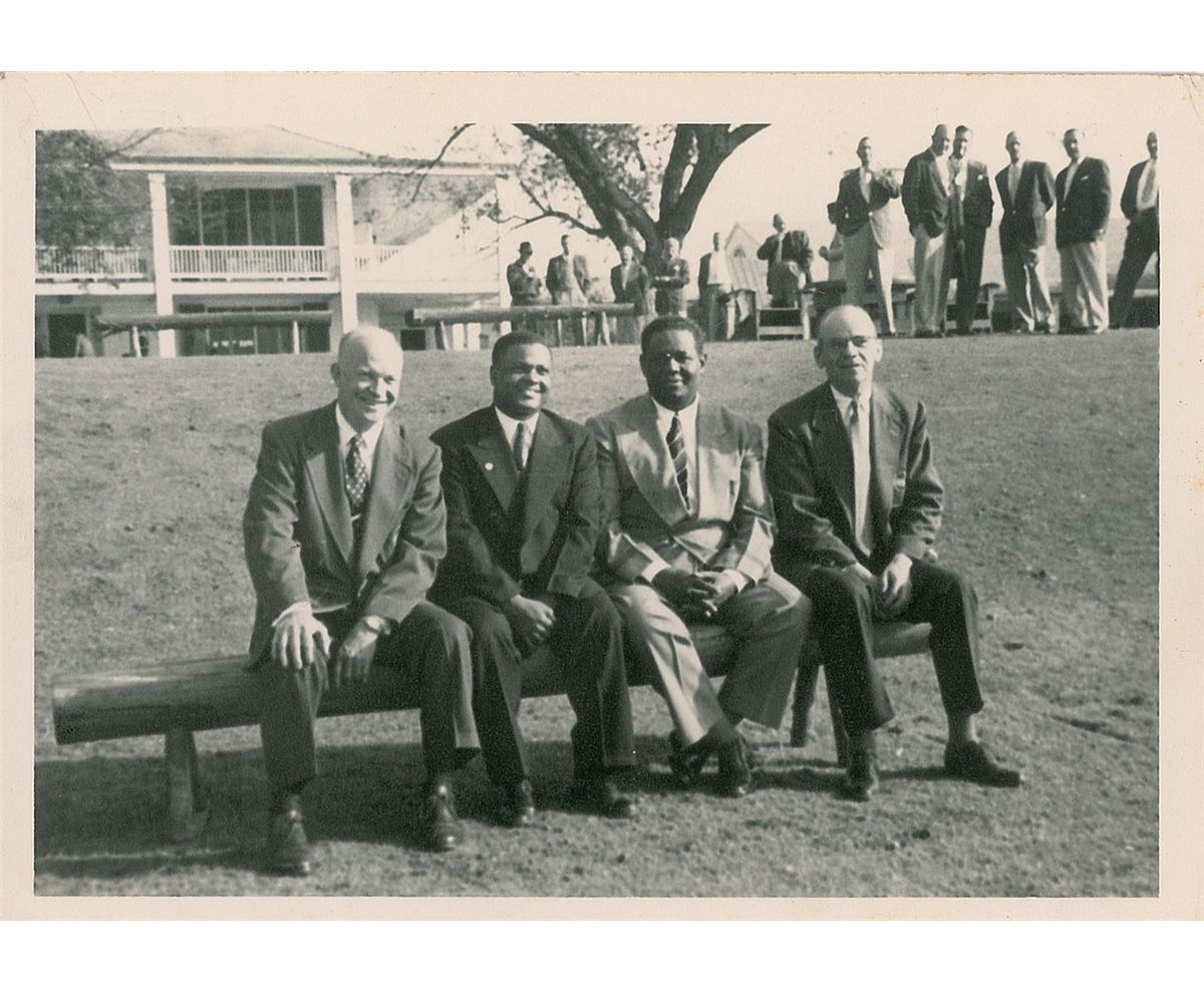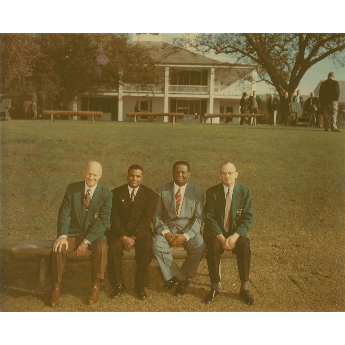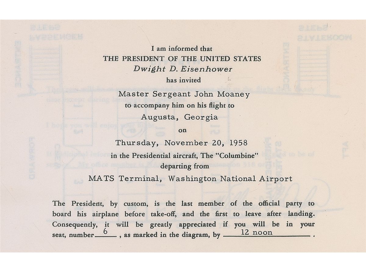 Brass button from Dwight D. Eisenhower’s personally-owned and -worn green Masters Tournament jacket, circa 1950s, measuring just under 1? in diameter. The button was manufactured by the Waterbury Button Company and features the Augusta National Golf Club logo in the center. Originates from the collection of Sgt. John Moaney, who served as Ike’s close personal valet from 1942 until the president's death in 1969, and includes two invitations with scheduling details for President Eisenhower’s flights from Washington to Augusta, Georgia, one for Sgt. John Moaney dated 1958 and one for Delores Moaney dated 1954. Also accompanied by three photos from the period, one showing President Eisenhower with Sgt. John Moaney on a bench at the exclusive golf club (picturing Ike wearing the green Master’s jacket that this button originated from) one showing Sgt. Moaney assisting President Eisenhower with his shoes, and one of the main building. Dwight D. Eisenhower was an avid golfer and frequented Augusta—the historic home of the Master’s—one of the course’s iconic features is known as the ‘Eisenhower Tree,’ a loblolly pine that the president unsuccessfully lobbied to have taken down because it interfered with his golf game.