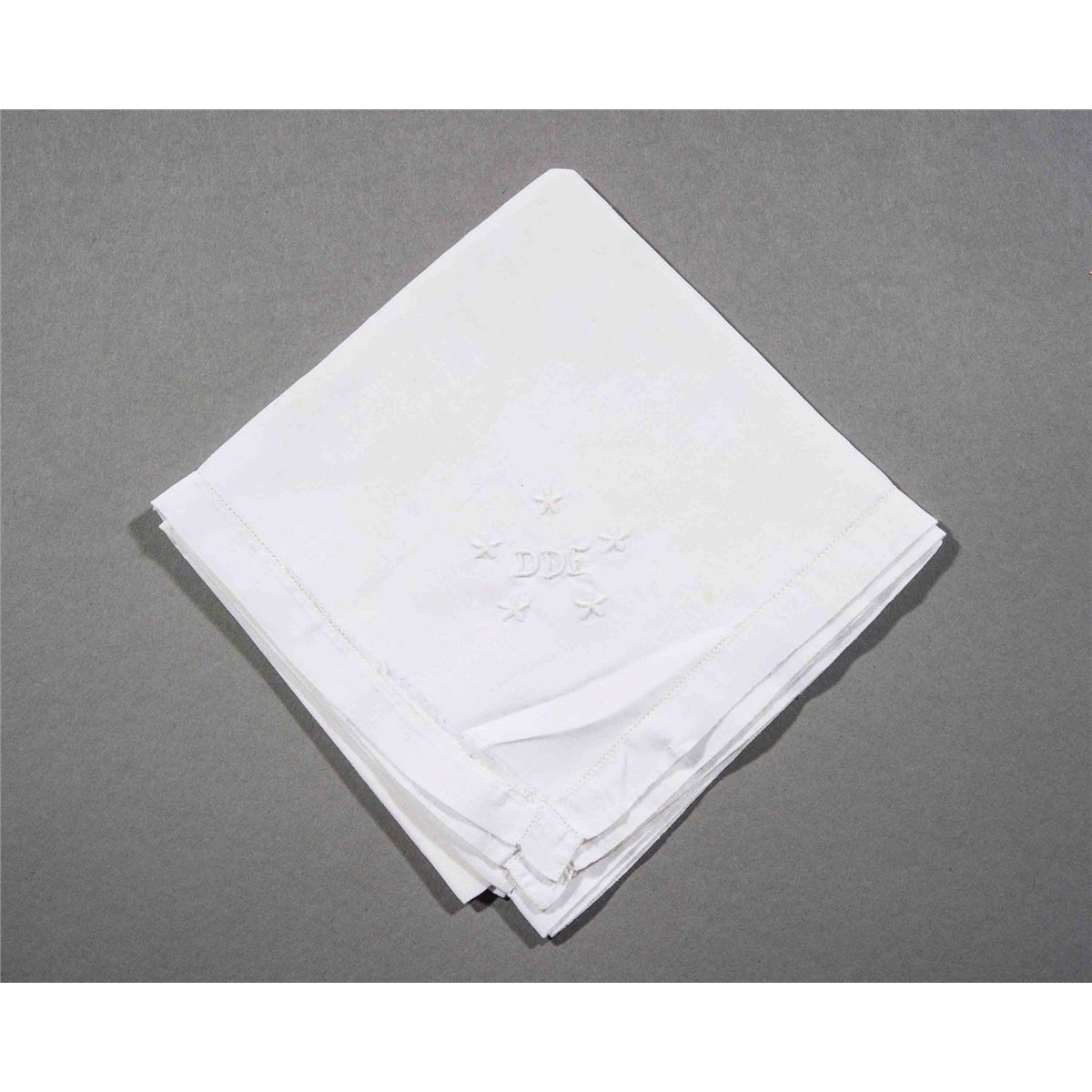 General Eisenhower’s personally-owned and -used off-white linen five-star general handkerchief, folded to an overall size of 5.5 x 5.5, finely embroidered in white thread with the symbolic five stars surrounding his initials, “DDE.” In fine condition. Includes a letter of provenance on a White House card from Delores Moaney, wife of Sgt. John Moaney, who served as Dwight D. Eisenhower’s valet beginning in 1942. In part: “The ‘DDE’ five-star handkerchief was owned and used by President Eisenhower. My husband packed the President’s personal effects as they traveled together from 1942–1969.” In splendid condition. A paramount relic in symbolic five-star motif—the rarest of all President Eisenhower hankies—straight from the pocket of the general to his own long-standing valet, Sgt. John Moaney, a faithful companion from 1942 through to Eisenhower’s passing.
