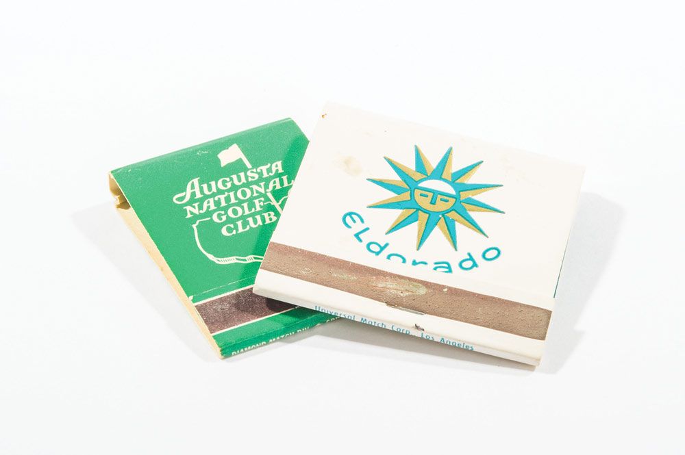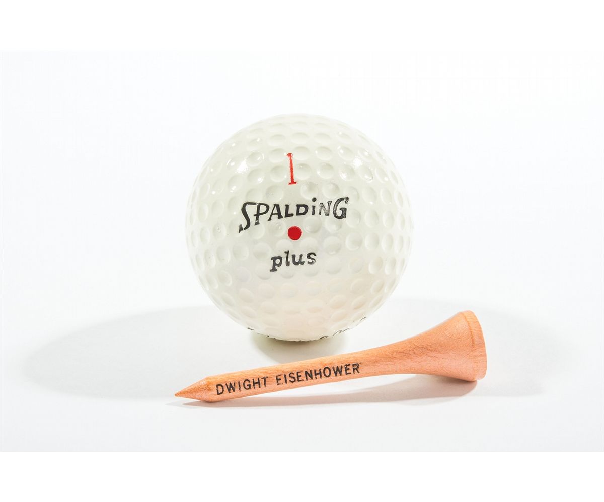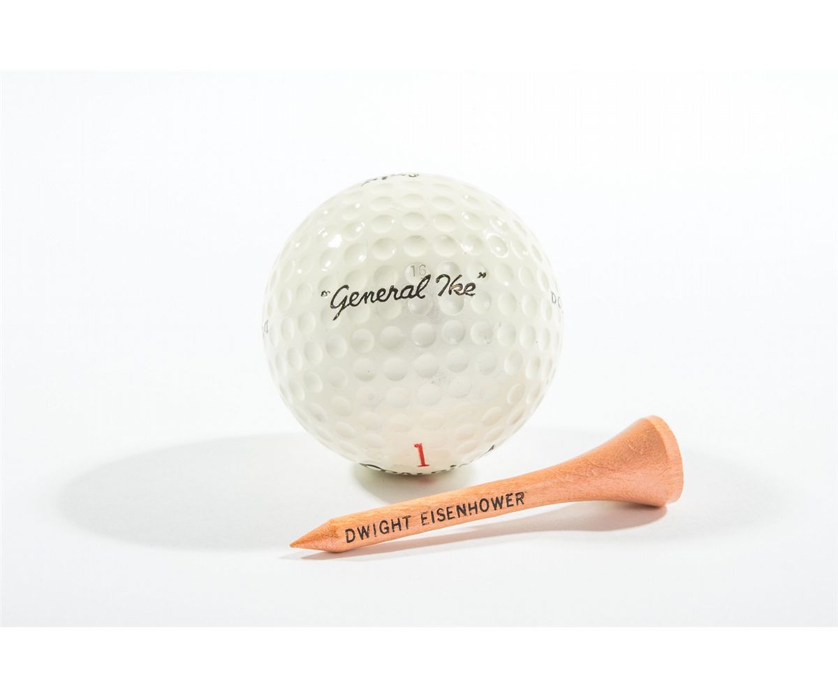President Eisenhower’s personally-owned and -used personalized Spalding golf ball, embossed in black on one side, “General Ike.” It also bears manufacturer’s marks that read “Spalding,” “1,” and “Dot Plus.” Accompanied by a peach golf tee stamped in black down the side, “Dwight Eisenhower,” as well as matchbooks from Augusta National Golf Club and Eldorado Country Club matchbooks. Eisenhower was an avid golfer, and had joined the exclusive Augusta National in 1948.