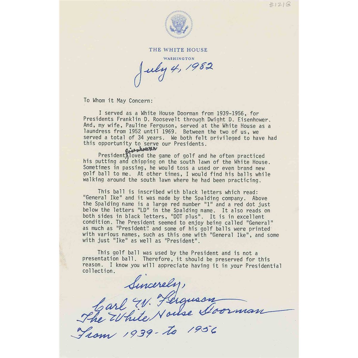 Includes a detailed letter of provenance on White House letterhead from White House doorman Carl W. Ferguson. As doorman, Ferguson saw the president daily on his way to the Oval Office. In part: “President Eisenhower loved the game of golf and he often practiced his putting and chipping on the south lawn of the White House. Sometimes in passing, he would toss a used or even brand new golf ball to me. At other times, I would find his balls while walking around the south lawn where he had been practicing…The President seemed to enjoy being called ‘General’ as much as ‘President’ and some of his golf balls were printed with various names, such as this one with ‘General Ike,’ and some with just ‘Ike’ as well as ‘President.’ This golf ball was used by the President and is not a presentation ball. Therefore, it should be preserved.” President Eisenhower’s enthusiasm for golf was well-known throughout the nation, and he is credited with helping to further popularize the sport—over his eight years in office, Ike played an average of about 100 rounds per year. An impressive group ensemble.