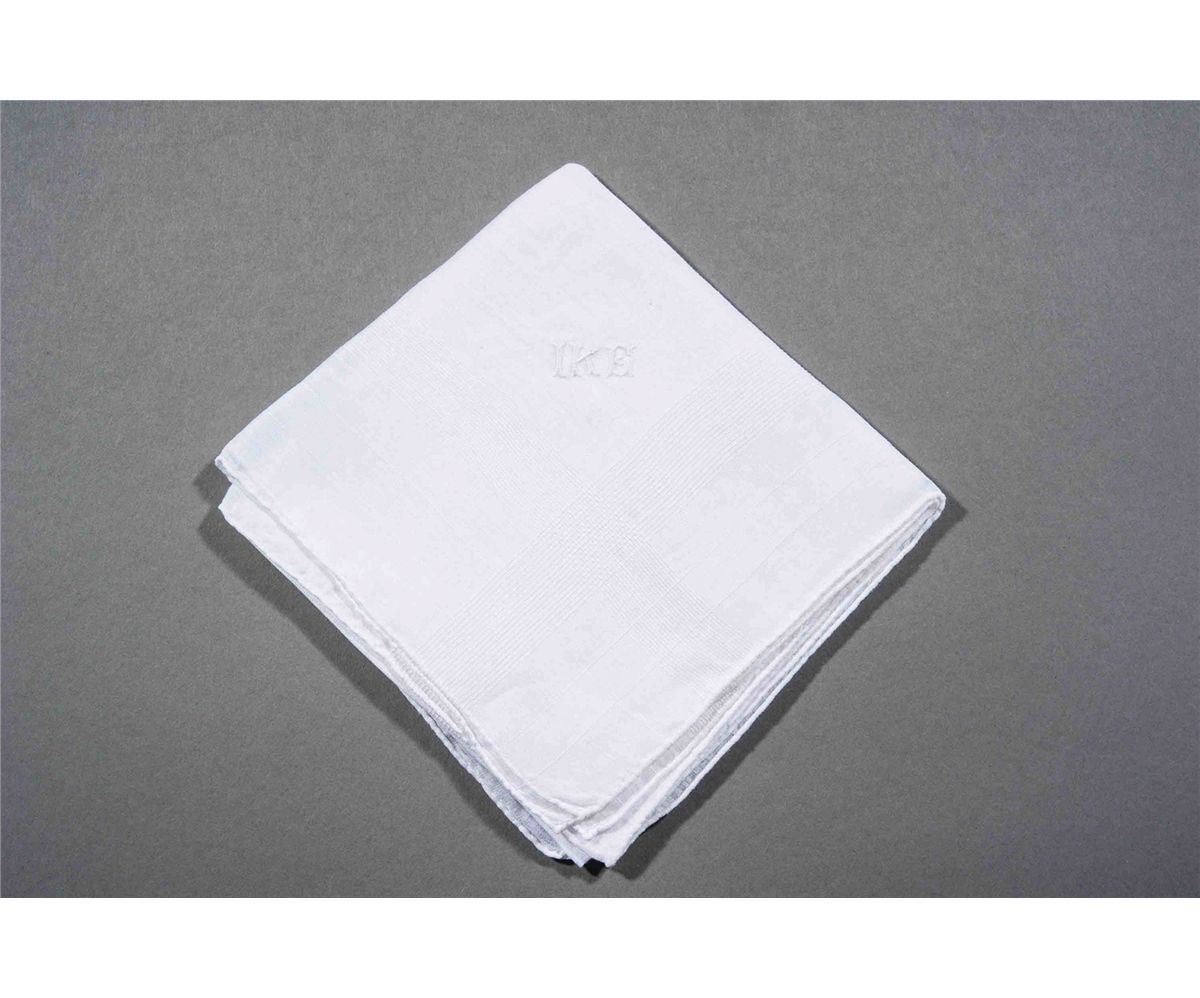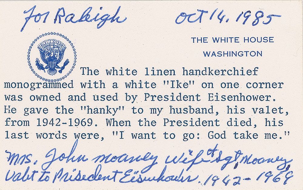 President Eisenhower’s personally-owned and -used off-white linen handkerchief, folded to an overall size of 5.5 x 5.5, finely embroidered in white thread, “Ike.” In fine condition. Includes a letter of provenance on a White House card from Delores Moaney, wife of Sgt. John Moaney, who served as Dwight D. Eisenhower’s valet beginning in 1942. In part: “The white linen handkerchief monogrammed with a white ‘Ike’ on one corner owned and used by President Eisenhower. He gave the ‘hanky’ to my husband, his valet, from 1942–1969.” A desirable personal artifact, straight from the pocket of the general to his own long-standing valet, Sgt. John Moaney.