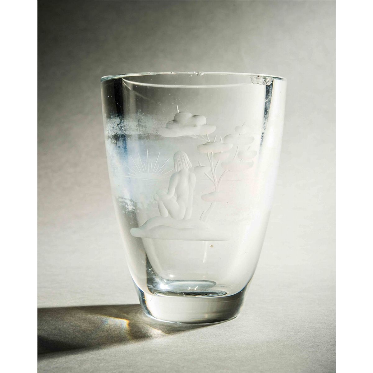 President and Mrs. Eisenhower’s personally-owned and -used vase. Heavy Swedish crystal vase stands 6? tall with an engraved image of a nude woman sitting on a hilltop watching the sunrise. Accompanied by a 1985 letter of authenticity on a White House card from Dolores Moaney, the Eisenhower’s personal cook and the wife of President Eisenhower’s valet, Sgt. John Moaney. Letter reads, in part: “The 6 1/2 in. Fine Swedish crystal was owned and used by President and Mrs. Eisenhower. After the death of the President on 3/28/69, Mamie gave it to Ike’s valet, Sgt. Moaney, who served the President from 1942–1969.” In very good condition, with a chip to top edge, and surface wear to the inside center portion of vase.