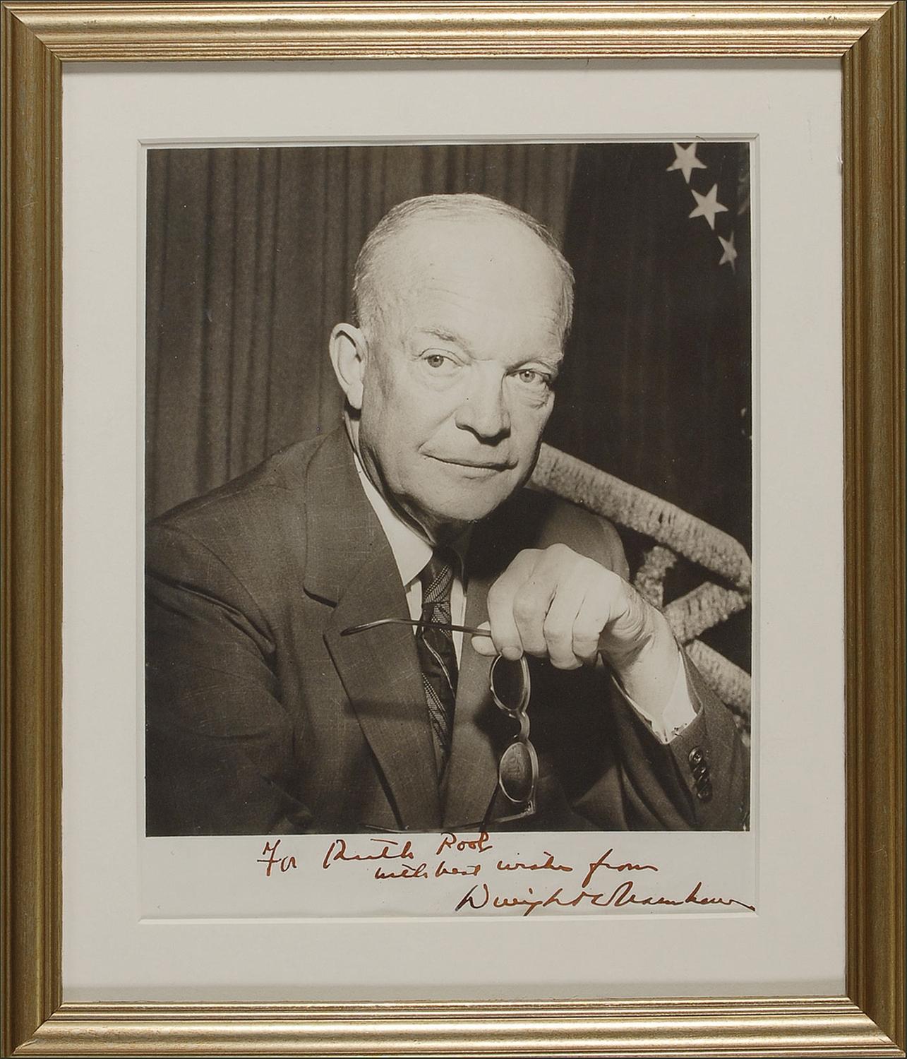 Vintage matte-finish 8 x 10 photo of Eisenhower at his desk, signed and inscribed in the lower border in fountain pen. Matted and framed to an overall size of 11.25 x 13.25. Two paperclip impressions to edges, some scattered light creases, and a bit of mild silvering, otherwise fine condition.