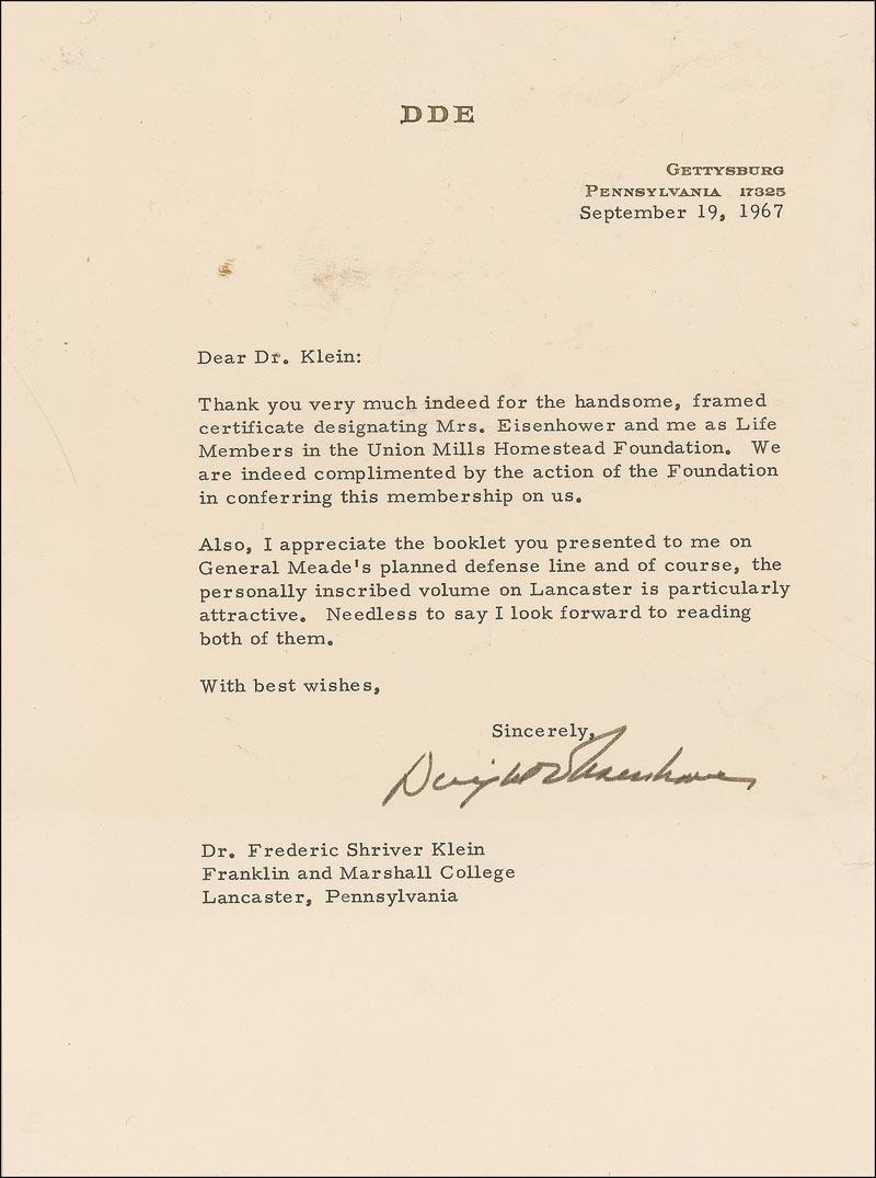 TLS, one page, 7 x 9.5, personal letterhead, September 19, 1967. Ike writes to Frederick Shriver Klein at Franklin and Marshall College in Lancaster, Pennsylvania. In part: “Thank you very much indeed for the handsome, framed certificate designating Mrs. Eisenhower and me as Life Members in the Union Mills Homestead Foundation. We are indeed complimented by the action of the Foundation in conferring this membership on us. Also, I appreciate the booklet you presented to me on General Meade’s planned defense line.” In very good condition, with mild creasing, wrinkling, spots of staining, several surface impressions, and an area of thin paper at the top of the page. Accompanied by the original mailing envelope.