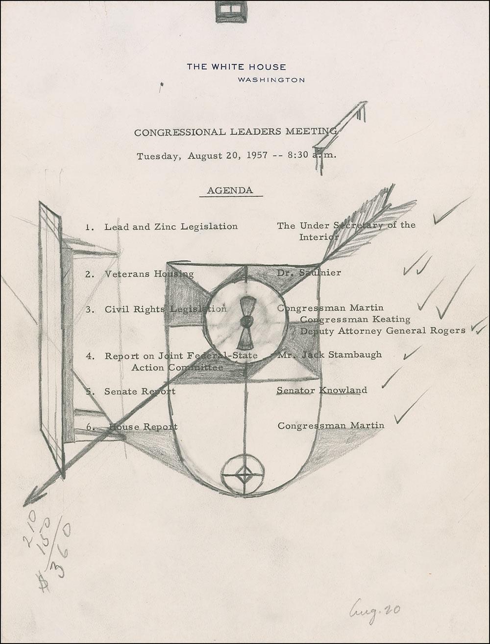 Original unsigned pencil sketch by Eisenhower on an 8 x 10.5 off-white sheet with the typed agenda for “Congressional Leaders Meeting [held on] Tuesday, August 20, 1957—8:30 am.” The doodle-inspiring agenda includes “1. Lead and Zinc Legislation [by] the Under Secretary of the Interior 2. Veterans Housing [by] Dr. Saulnier…6. House Report [by] Congressman Martin.” Eisenhower drew a large nuclear insignia with an arrow diagonally piercing it in the center of the paper. Along the left edge, he drew a long table, adding another small table at upper right. The right margin bears several check marks, while the lower left corner bears an addition equation. According to California Congressman Jack A. Anderson, Eisenhower’s Assistant Secretary of Agriculture and Special Administrative Assistant, Ike would often doodle while in meetings, using the agenda, note pads, or loose pieces of paper. After Eisenhower would complete a sketch, he would slip it underneath the blotter at his place at the Cabinet table. For a while, Anderson collected these sketches, but Eisenhower soon began to take the sketches with him and either throw them away or destroy them. In fine condition, with a couple of light intersecting folds. A particularly large and thought-provoking sketch showing where the president’s mind was during national business.