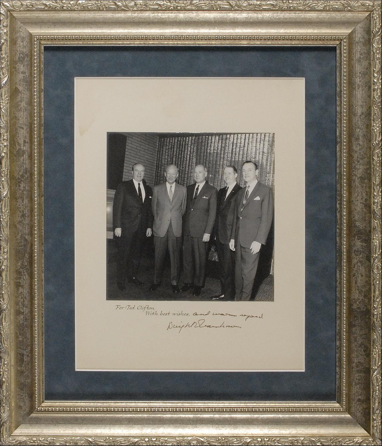 Vintage matte-finish 8 x 8 photo affixed to an 11 x 13.5 mount, signed in fountain pen beneath a calligraphic inscription, “For Ted Clifton, With best wishes,” with the president adding “and warm regards” before his signature. Suede-matted and framed to an overall size of 18 x 20.75. In fine condition, with thin strip of silvering at the edges and soiling to the top left side of the mount. The original recipient, Army Major General Chester V. "Ted" Clifton Jr., served in Italy in the Cassino and Anzio campaigns and in the invasion of southern France, and later was a senior military aide to President John F. Kennedy.