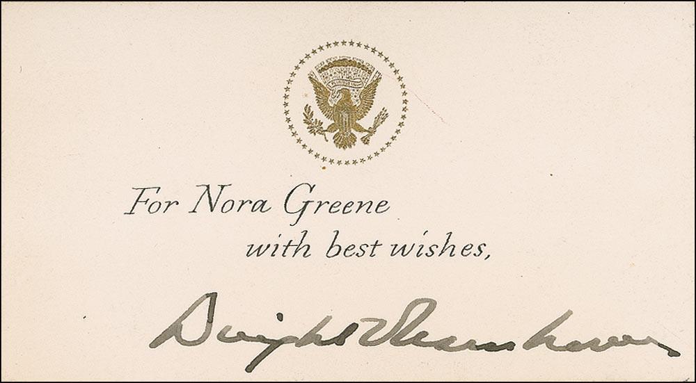 Ink signature, “Dwight D. Eisenhower,” on an off-white 4.25 x 2.25 card, with a gold embossed presidential seal at the top, and also with an inscription in a calligrapher’s hand above signature which reads, “For Nora Greene, with best wishes.” In fine condition, with a couple stray marks and a bit of mild toning.