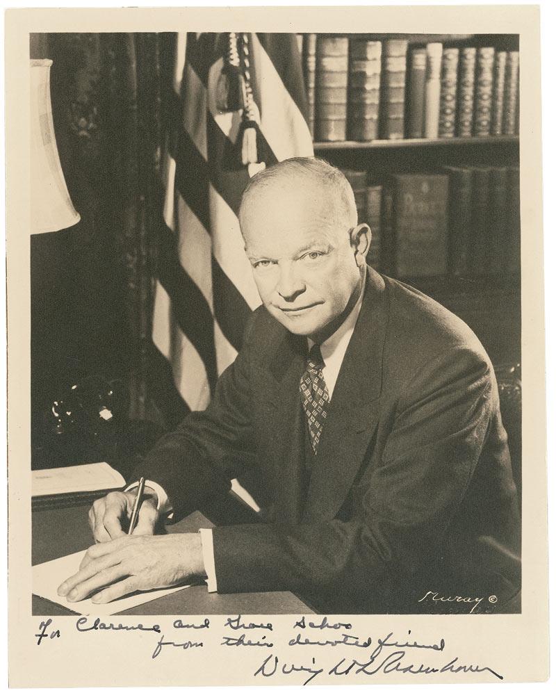 Vintage matte-finish 8 x 10 photo of the president seated at his desk, signed and inscribed in fountain pen “For Clarence and Grace Schoo from their devoted friend, Dwight D. Eisenhower.” Affixed to a same-sized piece of heavy cardstock. A few small creases and trimmed edges, otherwise fine condition.