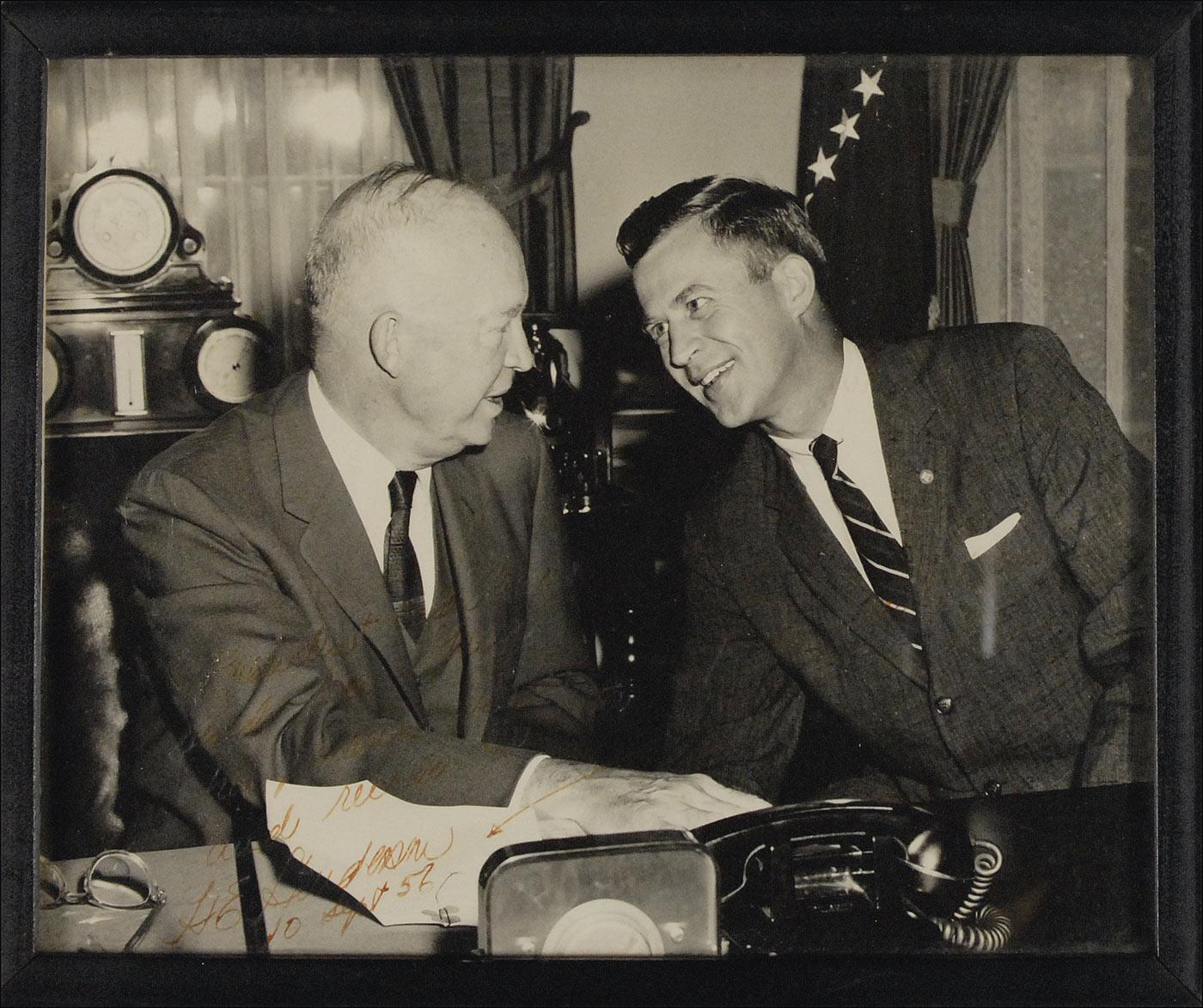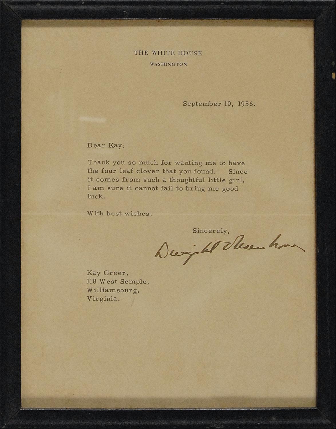 TLS as president, one page, 6.5 x 8.5, White House letterhead, September 10, 1956. Letter of thanks to Kay Greer for a letter and a four-leaf clover. In full: “Thank you so much for wanting me to have the four leaf clover that you found. Since it comes from such a thoughtful little girl, I am sure it cannot fail to bring me good luck.” Framed to an overall size of 7.5 x 9.75. Uniform moderate toning, otherwise fine condition. Accompanied by an original 10 x 8 photo of Eisenhower at his desk, with the little girl’s letter and four leaf clover visible in front of the president, and talking to another gentleman, notated in the gentleman’s hand, “President Eisenhower sends Kay Greer his personal wishes and receives her letter at the White House, 10 Sept. 56.” Photo is also framed to an overall size of 10.5 x 8.5, with heavy contrast to notation.