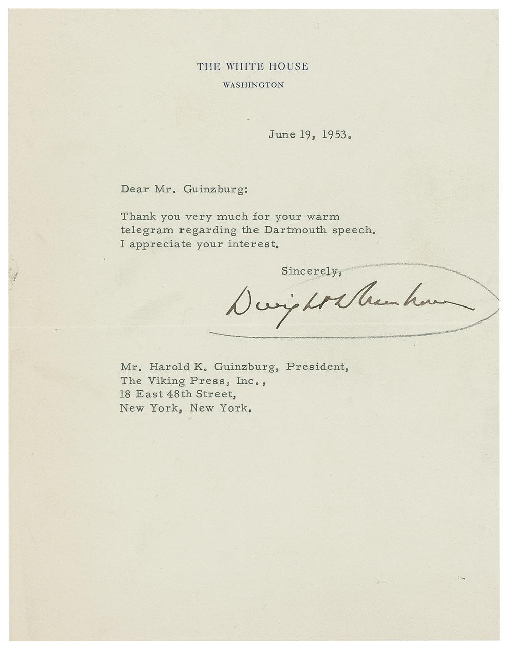 TLS as president, one page, 7 x 9, White House letterhead, June 19, 1953. Brief letter of thanks regarding a speech Eisenhower gave at Dartmouth University. In full: “Thank you very much for your warm telegram regarding the Dartmouth speech. I appreciate your interest.” In fine condition, with a few scattered light creases.